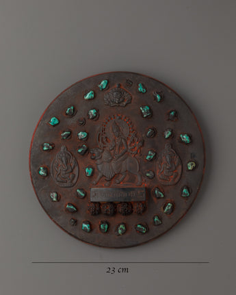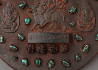 Bring heavenly strength and fierce protection into your sacred area with this exquisitely created Goddess Durga Wall Hanging, which measures 23cm by 23cm and weighs 0.57 kilograms. This circular plaque, made of wood and embedded with turquoise-like stones, features a powerful image of Goddess Durga riding her lion, surrounded by sacred symbols and deities such as Ganesha. The artistry and symbolism make it an ideal embodiment of Shakti, the divine feminine spirit that removes bad energies and restores equilibrium.