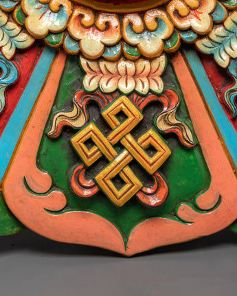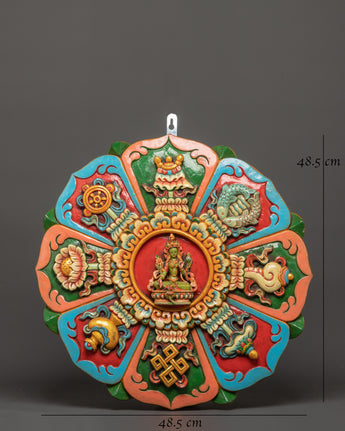 This handcrafted Green Tara wall hanging is an exquisite depiction of the revered Buddhist deity recognized for her compassion, protection, and prompt assistance in times of need. This sacred artwork, beautifully carved from high-quality wood and coated in brilliant acrylic colors, makes an excellent focal point for meditation spaces, yoga studios, or spiritual home decor. Its height and width are 48.5cm, making it a striking and meaningful addition to any religious or ornamental space.