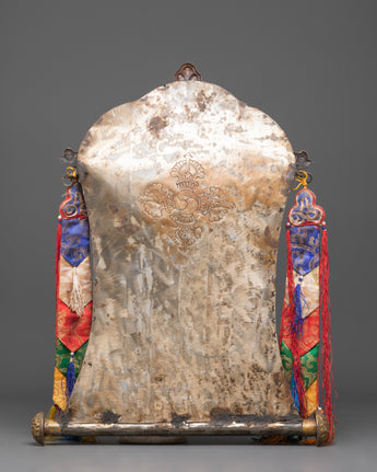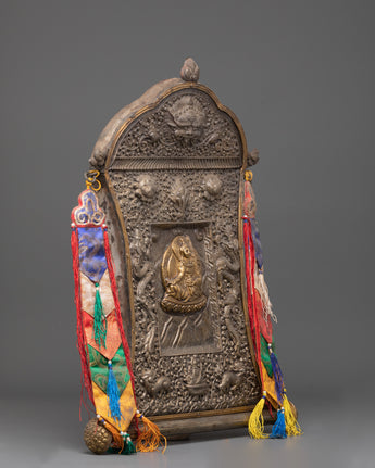The artistry of this iron wall piece reflects traditional Tibetan craftsmanship at its finest. Every curve, pattern, and embellishment is meticulously hand-worked, with ornate floral motifs and auspicious symbols surrounding the central figure. Adorned with colorful brocade tassels, this piece brings life, texture, and vibrancy to your spiritual environment, perfectly balancing strength and grace.