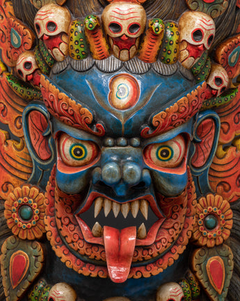 Hand-Carved Tibetan Mahakala Mask Wall Art | Fierce Guardian Deity Mask