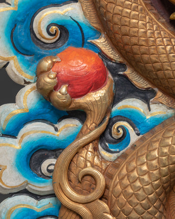 This dragon wall hanging is crafted with remarkable skill and elegance. The sculpture is made of repousse copper and hand-hammered to perfection, guaranteeing that each scale and curve is precise and graceful. The dragon's body is adorned with gold-plated details, which lend a touch of radiance and elegance. The combination of copper and gold produces a stunning contrast that highlights the dragon's colorful, dynamic motion, which is further enhanced by the clouds and orbs that surround it, resulting in a mesmerizing and magical design.