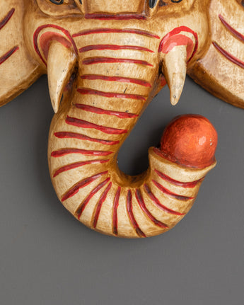 This handcarved wooden Ganesha head wall hanging symbolizes wisdom, fortune, and protection. It is beautifully carved and painted in vibrant colors of red, green, yellow, and beige, capturing Lord Ganesha's compassionate yet strong nature. This artwork is ideal for complementing bohemian décor, sacred altars, or spiritual areas, as it adds clarity, focus, and calm to the environment. Its pleasant energy will uplift any room, resulting in a peaceful and harmonious environment.