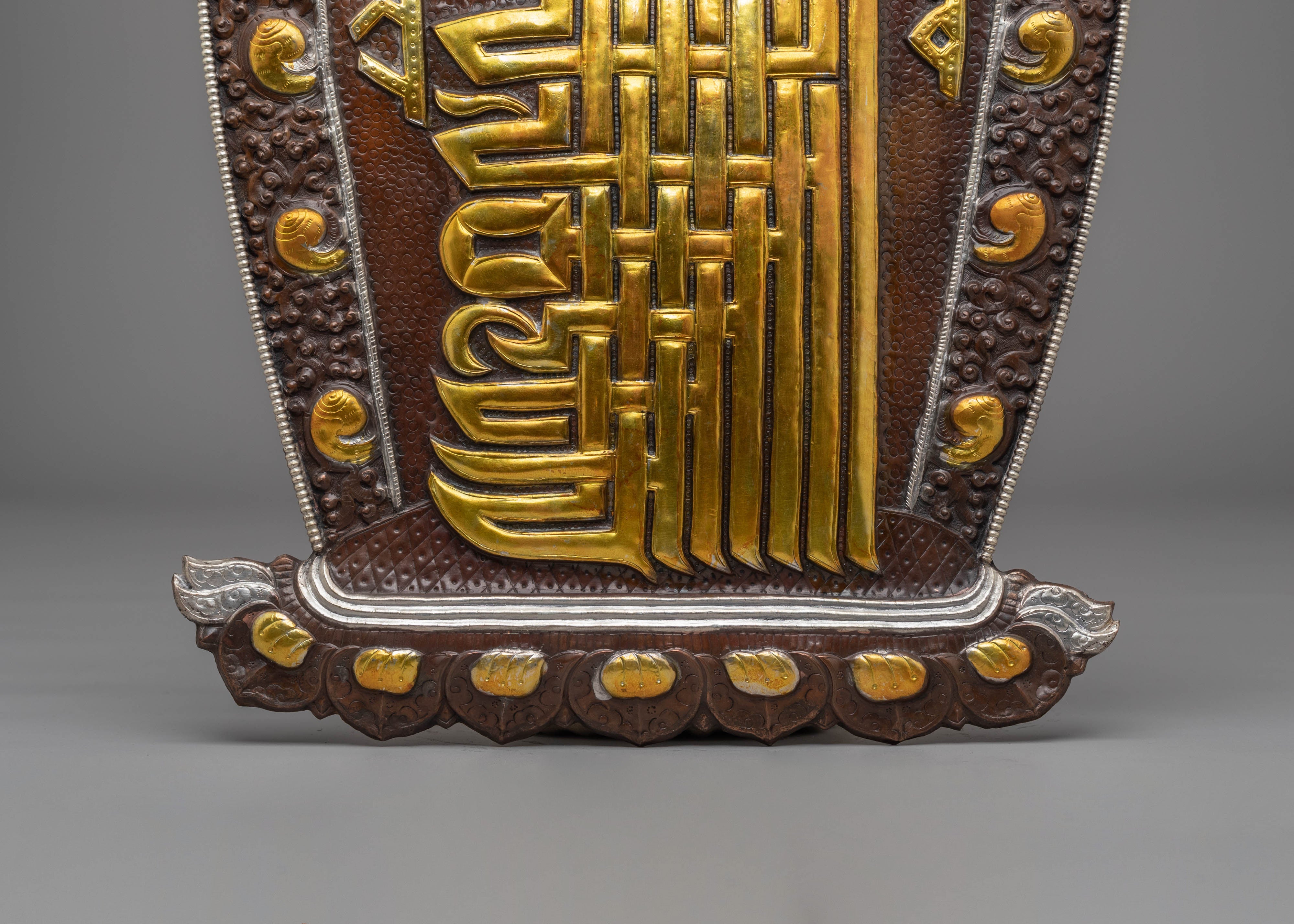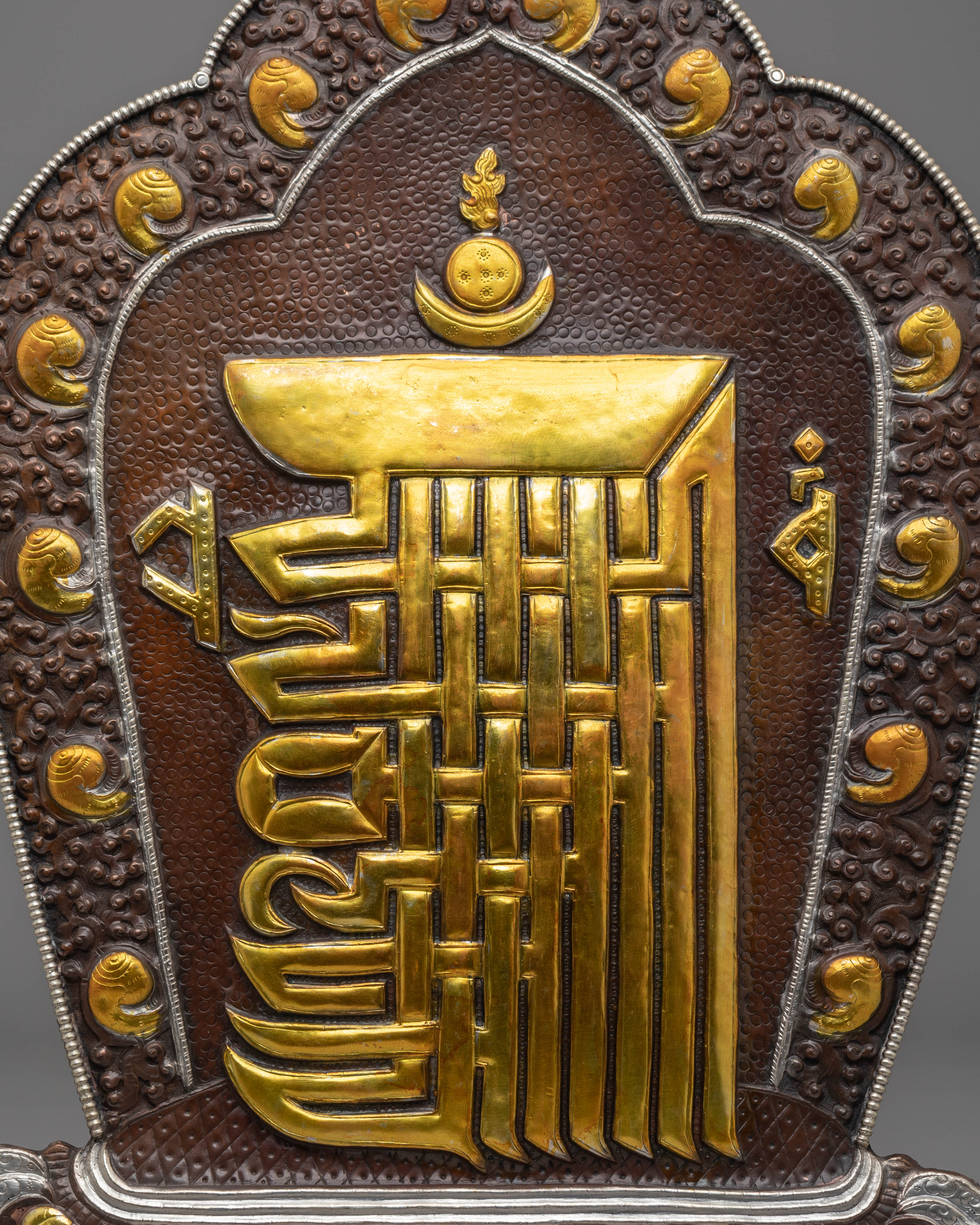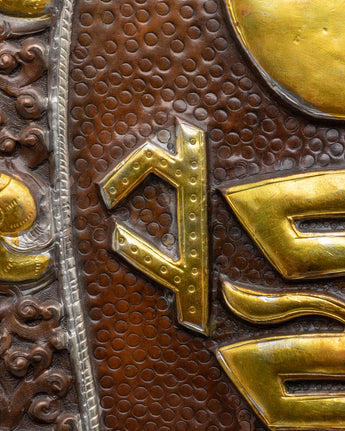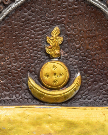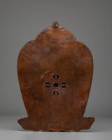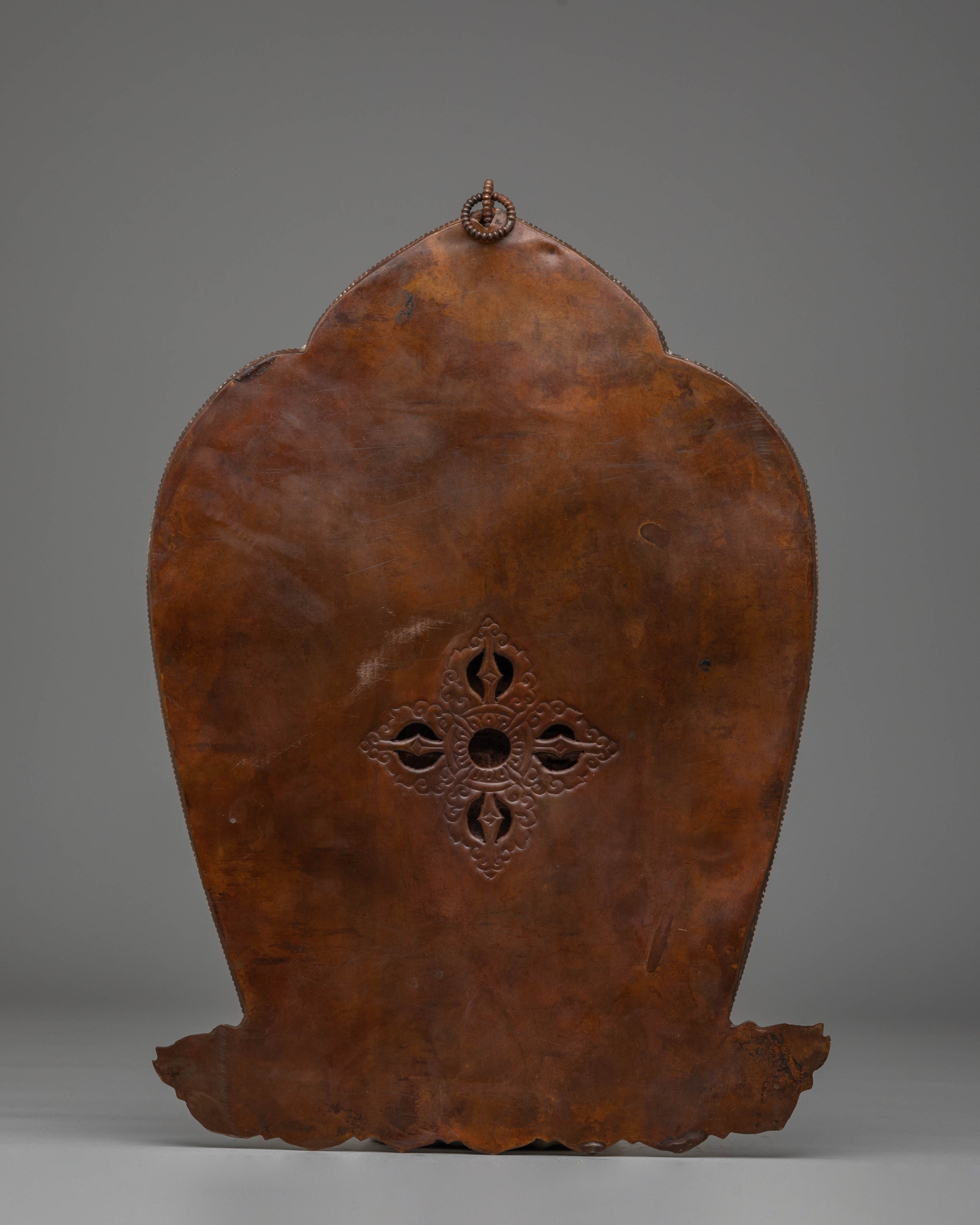 The Kalachakra symbol is depicted in exquisite detail, with vibrant electro-gold and electro-silver plating enhancing the sacred design. The oxidized copper body gives the piece a timeless, antique look while maintaining its strong symbolic presence. The intricate patterns and geometric motifs represent the cyclical nature of life and the teachings of Kalachakra, which focus on meditation, spiritual practice, and the alignment of the body, mind, and spirit. This wall hanging serves as both a decorative and powerful spiritual tool for those seeking to connect with the profound wisdom of the Kalachakra teachings.