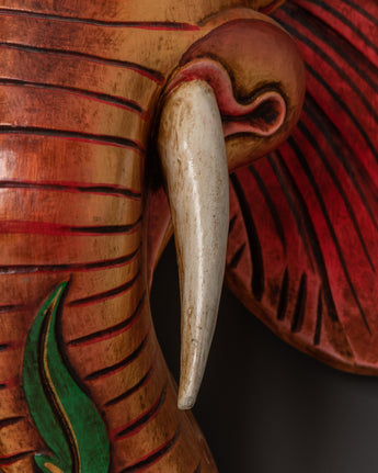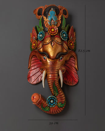 This handcrafted Ganesha wall hanging is a splendid homage to the revered Hindu deity associated with wisdom, protection, and the elimination of obstacles. This large piece is meticulously hand-carved from wood and artistically painted with acrylics, showcasing a golden elephant head adorned with deep red ears, curved tusks, and a tranquil expression. The vivid floral crown and blue details energize the design, imparting both dynamism and elegance.