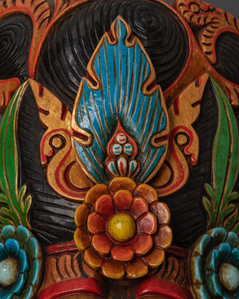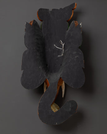 This Ganesha mask, measuring over 80 cm in height, exudes a formidable presence in any environment. The rear is designed for placement against a wall and features a constructed thread for convenient hanging. This wooden artwork holds spiritual significance and serves as a captivating decorative element, whether displayed in a meditation room, yoga studio, or above a home altar.