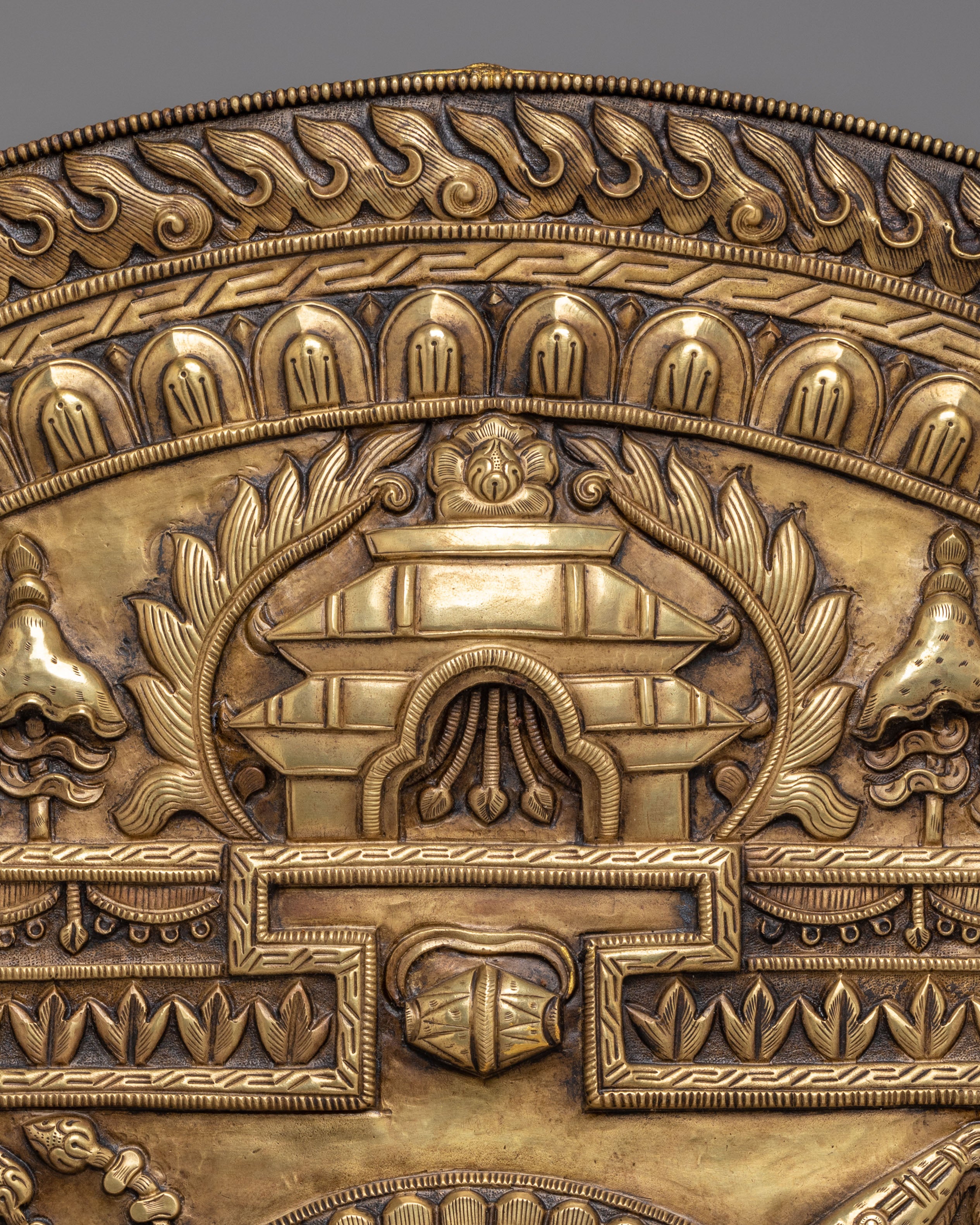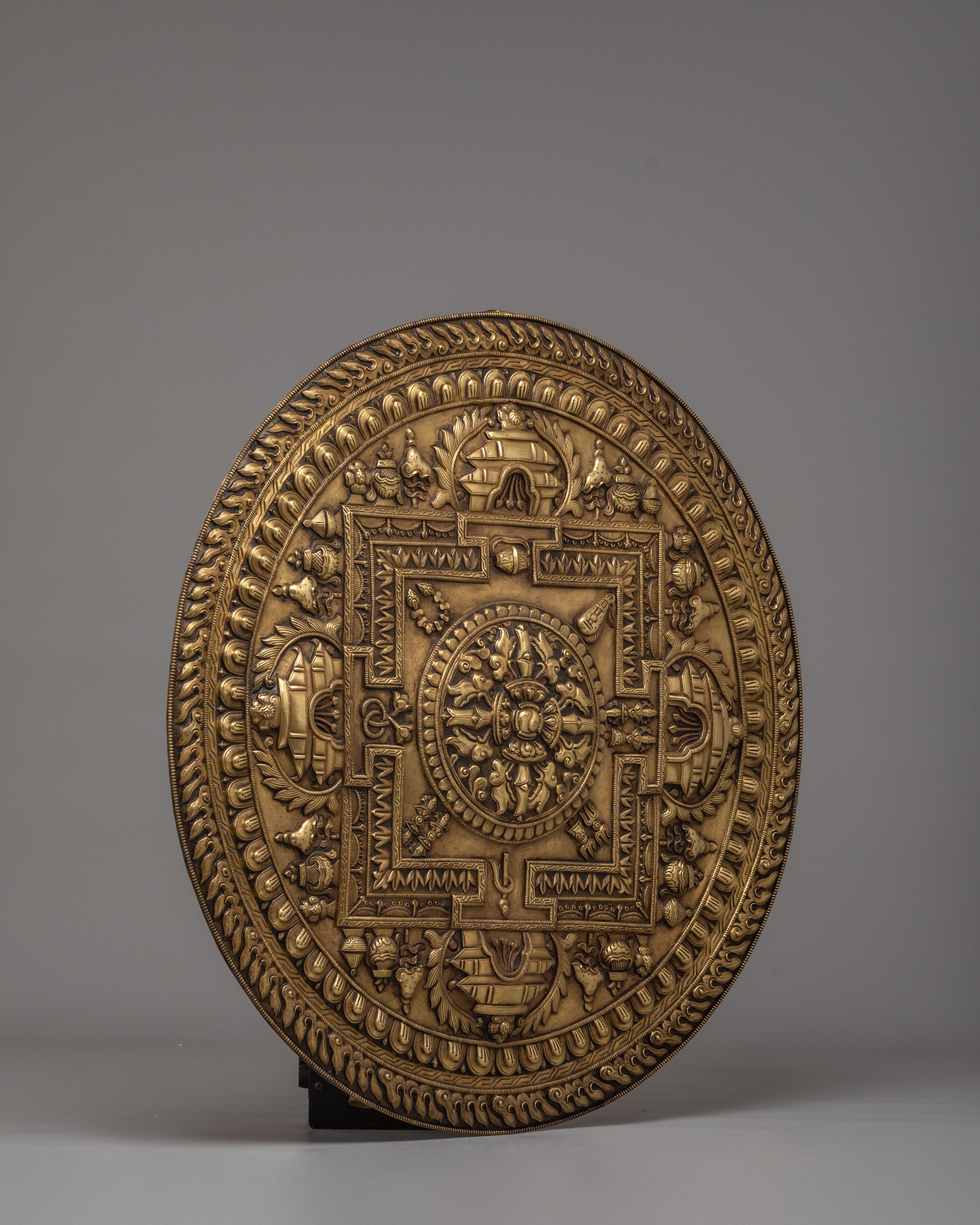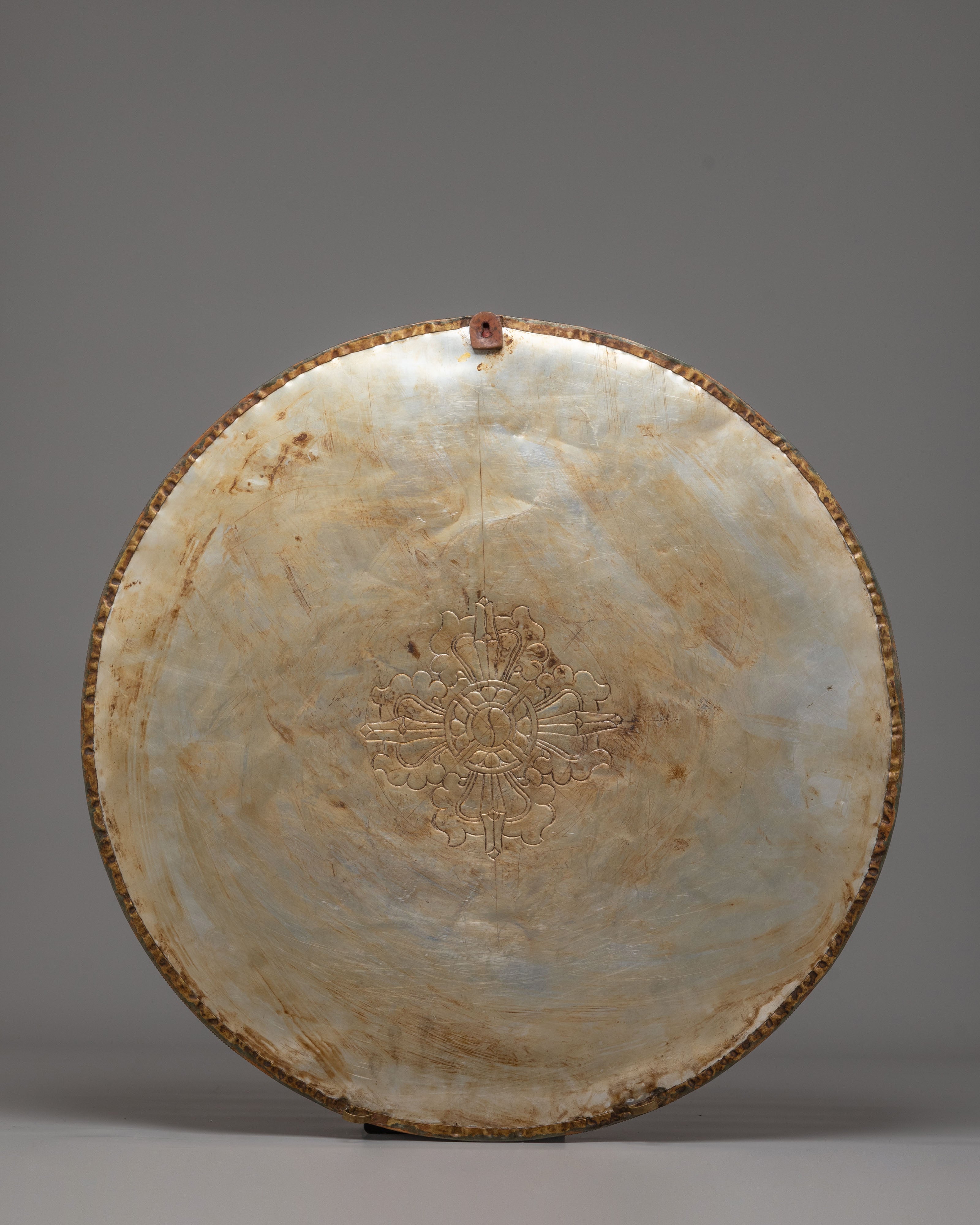 Iconographically, the Vajra in the center of the mandala represents the unity of wisdom and compassion, a fundamental principle in Vajrayana Buddhism. The intricate surrounding patterns and symbols represent the cycle of life, death, and rebirth, as well as the removal of spiritual obstacles. The outer edge of the mandala is adorned with protective symbols and energy motifs, enhancing the visual representation of the universe’s harmony and balance. The copper material adds a warm, sacred energy to the piece, making it a powerful tool for meditation, ritual practices, and spiritual focus.