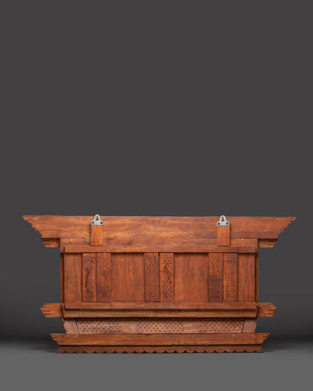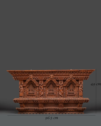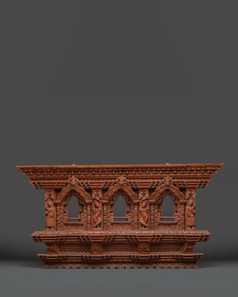 This huge Sacred Architecture Decor item is a striking reflection of Nepal's architectural and spiritual traditions, handcrafted entirely of wood. This classic multi-arched window panel, measuring 49 cm high and 96.5 cm wide, and weighing 8.89 kg, replicates the sacred front of Newari temples located in Kathmandu's medieval courtyards. Each arch is gently framed by elaborate columns and divine figures, giving homage to ancient craftsmanship and Himalayan mysticism.