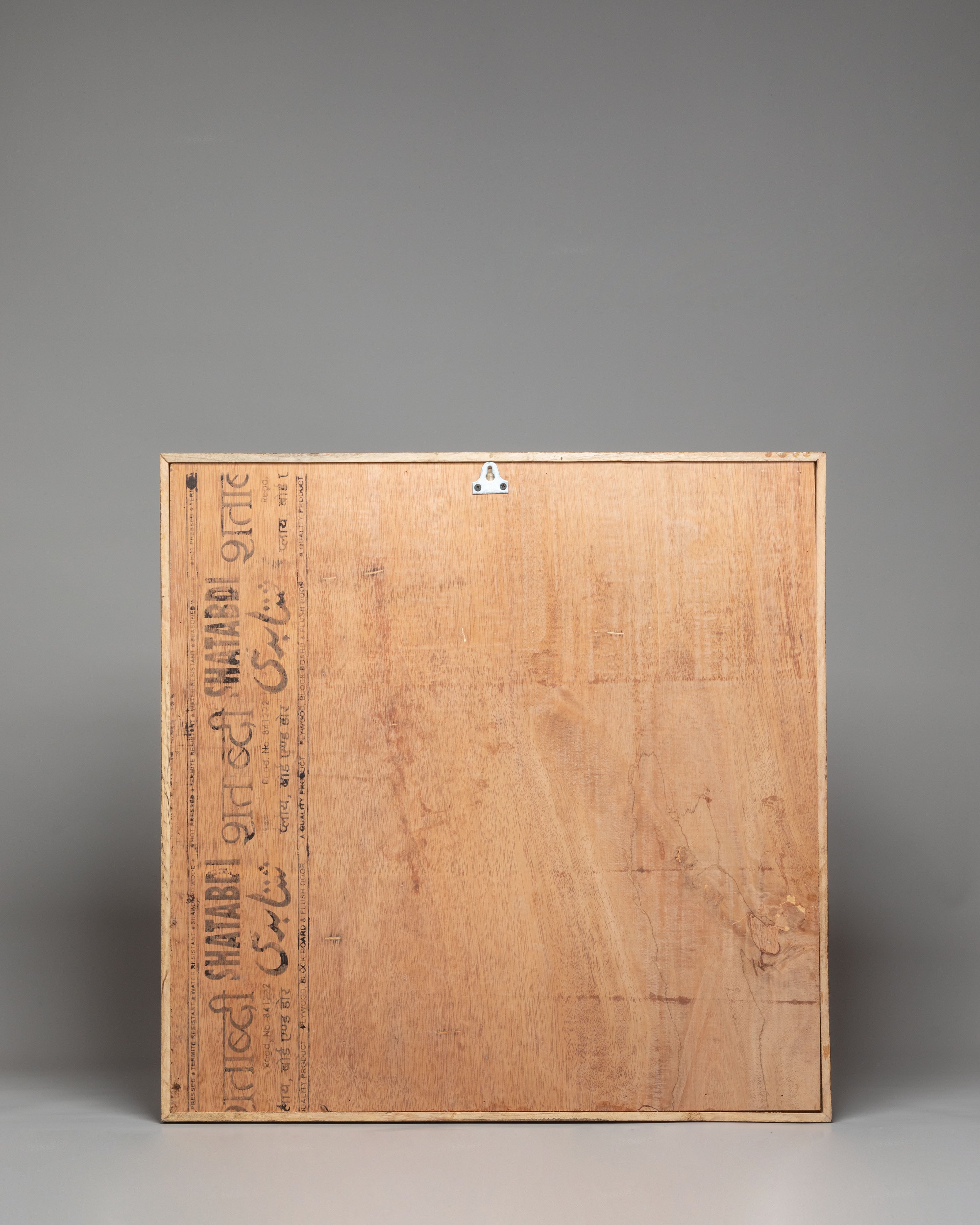 This Sacred Buddha Shakyamuni Wall Hanging is an exquisite and powerful piece of Tibetan art, featuring the historical Buddha, Shakyamuni, seated in the meditative lotus position. Measuring 76.5 cm in height and 77 cm in width, this handcrafted wall hanging is made with stone-dust epoxy binding and features a wooden back for ease of hanging. The Shakyamuni Buddha, the embodiment of enlightenment and wisdom, is at the center of the mandala design, representing the path to spiritual awakening, inner peace, and the attainment of nirvana.