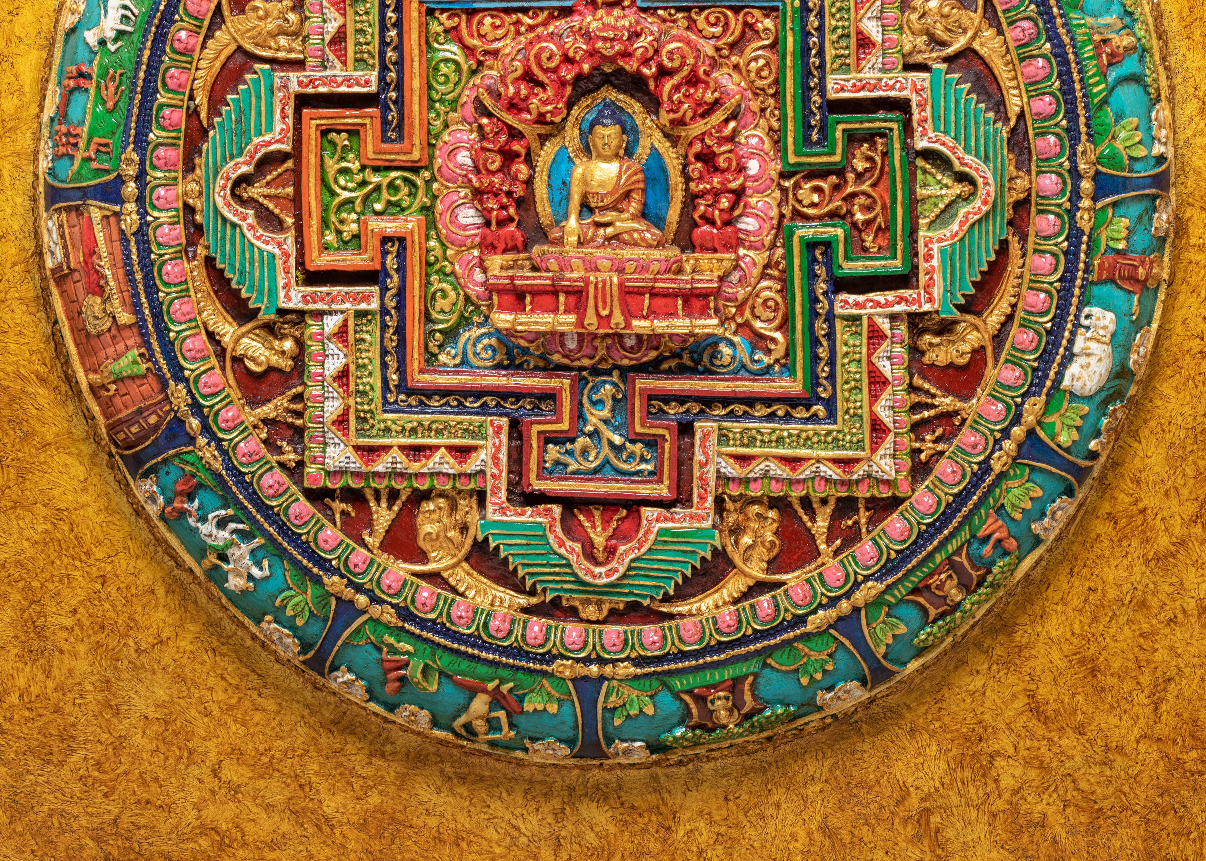 The design of this Shakyamuni Buddha Wall Hanging incorporates vibrant colors and intricate motifs surrounding the central Buddha figure. The mandala represents the cosmos and the interconnectedness of all beings, while the lotus petals symbolizing purity and spiritual growth surround the Buddha. The outer circle is filled with traditional Tibetan patterns and divine symbols, creating a sense of sacredness and unity. The stone dust epoxy binding enhances the detailed carvings, while the gold and jewel accents bring warmth and illumination to the piece, adding spiritual depth and visual harmony.