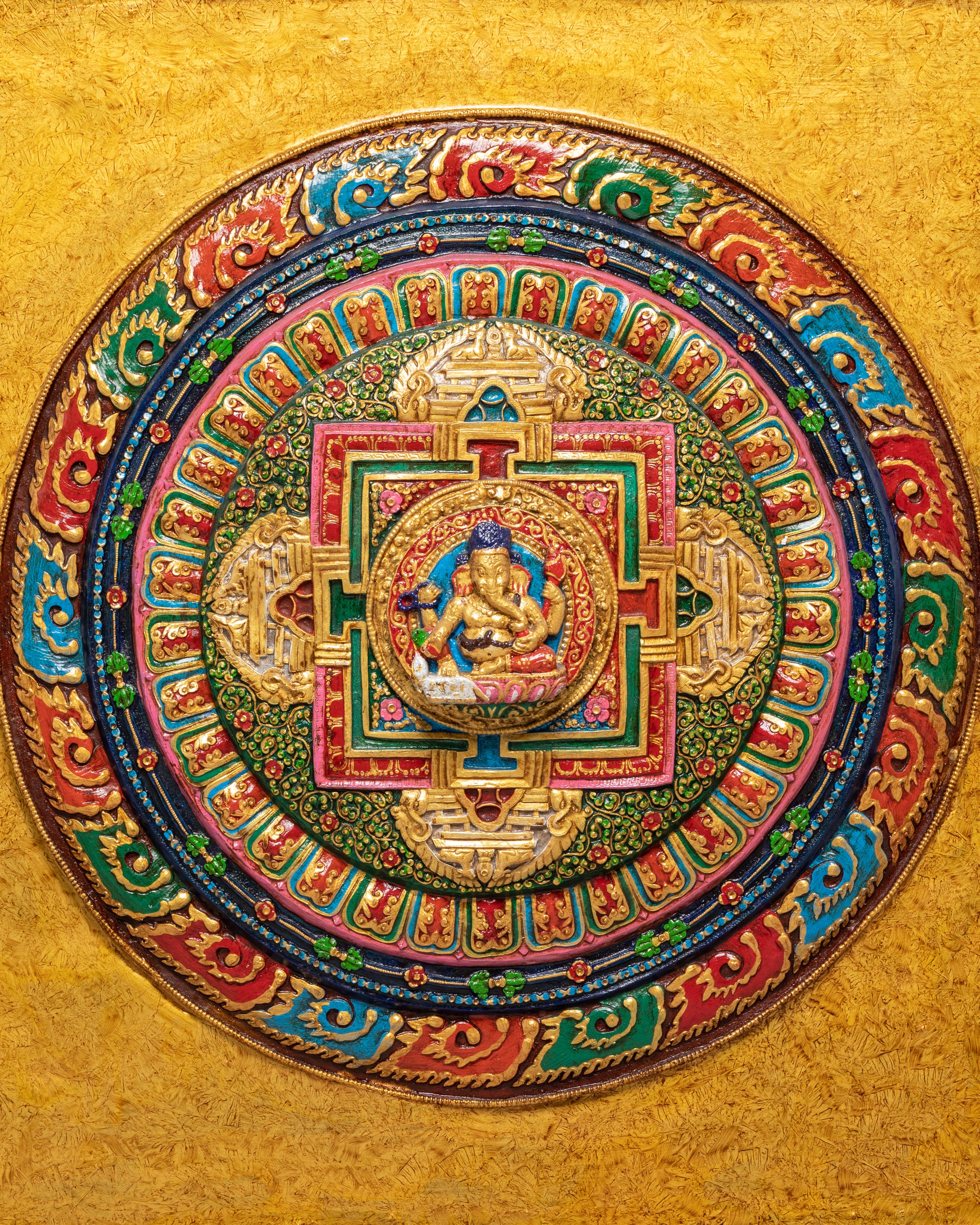 The design of the Ganesh wall hanging is rich in symbolism and craftsmanship. Ganesh is depicted with his iconic elephant head, which represents strength and wisdom. At the same time, his multiple arms hold sacred items such as the modak (a sweet), symbolizing prosperity, and the axe, representing the cutting away of obstacles. Surrounding Ganesh are intricate Hindu motifs and symbolic designs, including lotus petals, elephants, and flowers, all of which enhance the sacred nature of the artwork. The stone dust epoxy gives the piece a timeless, textured finish, while the vibrant colors and gold accents illuminate the divine figure of Ganesh, making it a captivating focal point in any room.