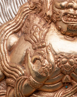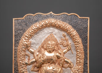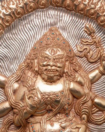This powerful Six-Armed Mahakala depiction is carefully designed to showcase the deity's multiple arms, each symbolizing a different protective aspect. The gold plating gives the piece an elegant and radiant finish, while the silver plating adds depth and dimension, highlighting the intricate details. The copper body ensures the durability and timeless quality of the statue, making it both an artistic masterpiece and a spiritual tool to invoke protection and remove spiritual hindrances.