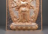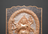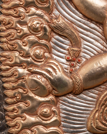 The Six-Armed Mahakala Wall Hanging is a stunning and powerful spiritual artwork, expertly handcrafted with a copper body, gold plating, and silver plating. With dimensions of 49.5cm in height and 36.5cm in width, and a weight of 1.18kg, this intricate piece portrays Mahakala, the fierce protector deity in Tibetan Buddhism. Mahakala is revered for his ability to protect practitioners and remove obstacles, making this wall hanging a significant symbol of strength, spiritual power, and protection for any sacred space.