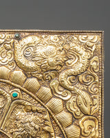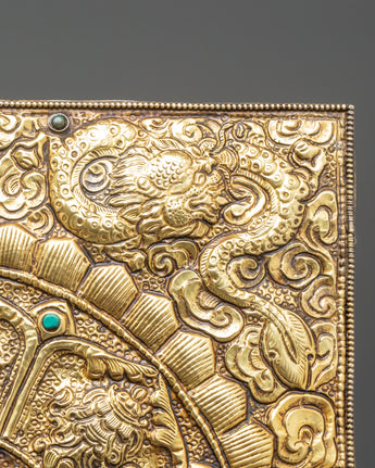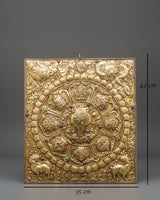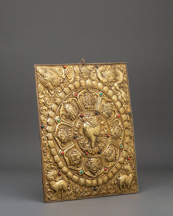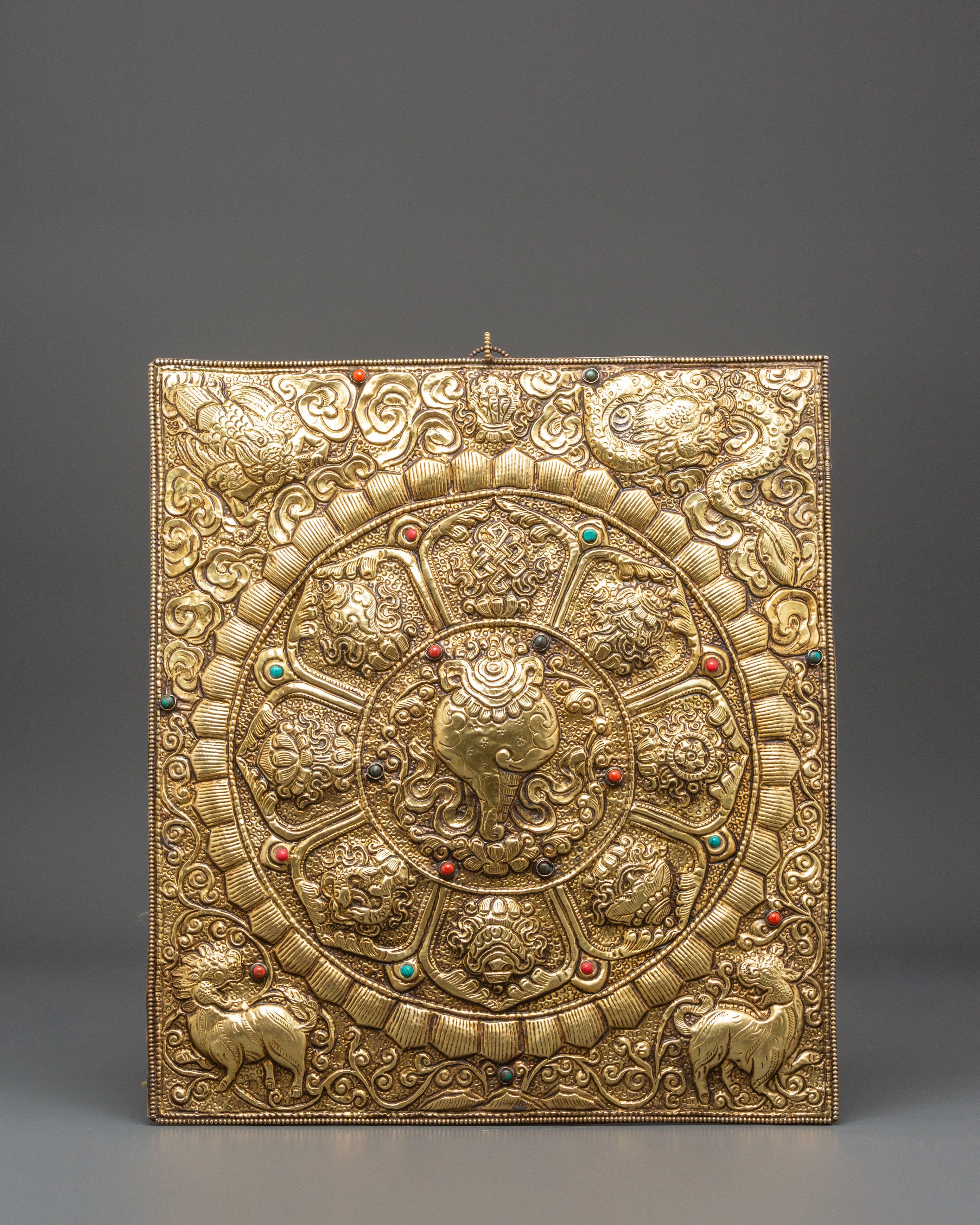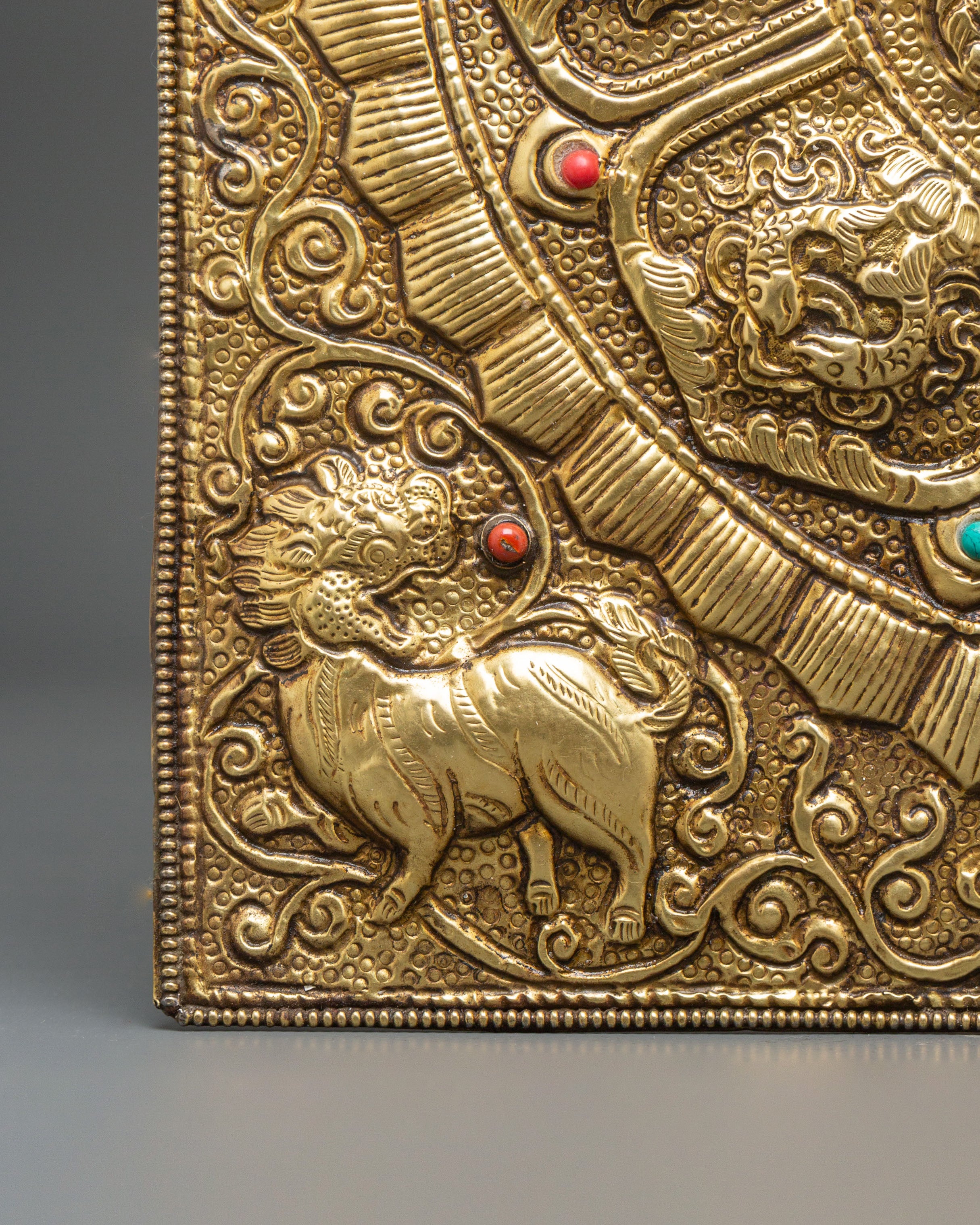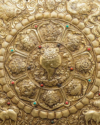 Surrounding the central motif are beautifully detailed symbols—Lotus, Endless Knot, Parasol, Golden Fish, and others—each representing spiritual blessings, purity, and peace. The corners feature intricate carvings of mythical creatures, enhancing the energy of protection and good fortune. The golden brass tone, paired with touches of red and turquoise stones, reflects traditional Tibetan aesthetics that celebrate balance, enlightenment, and prosperity.