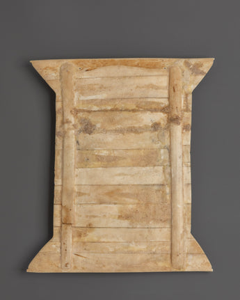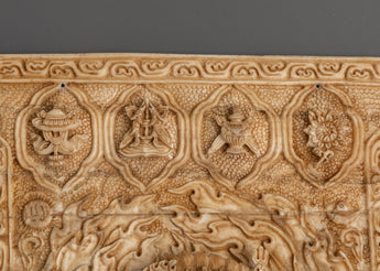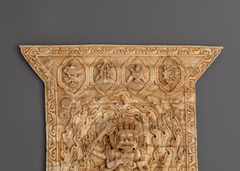 The Tibetan Bone Carving Four Armed Mahakala is a magnificent depiction of one of Tibetan Buddhism's most powerful protector deities. This meticulously crafted monument, measuring 31.5cm tall and 27cm wide, is made of ethically sourced buffalo bone, ensuring both spiritual purity and environmental respect. Mahakala, renowned for his strong and protective character, is depicted with four arms, each representing his ability to remove obstacles and shield practitioners from negative energies. The elaborate bone carvings emphasize the deity's imposing stature and wrathful face, making it a standout addition to any altar or shrine.