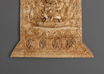 This Four-Armed Mahakala sculpture represents the spiritual strength and divine protection that Mahakala provides. Each detail, from the furious countenance to the dynamic position, depicts the deity's role as a custodian of the Dharma, removing harmful energy. The use of sustainably obtained buffalo bone not only lends the statue a distinct texture but also enhances its sanctity, as the material is traditionally associated with protection and spiritual power. The intricate bone carving contrasts with the natural beauty of the material, creating a magnificent visual portrayal of Mahakala's protective power.