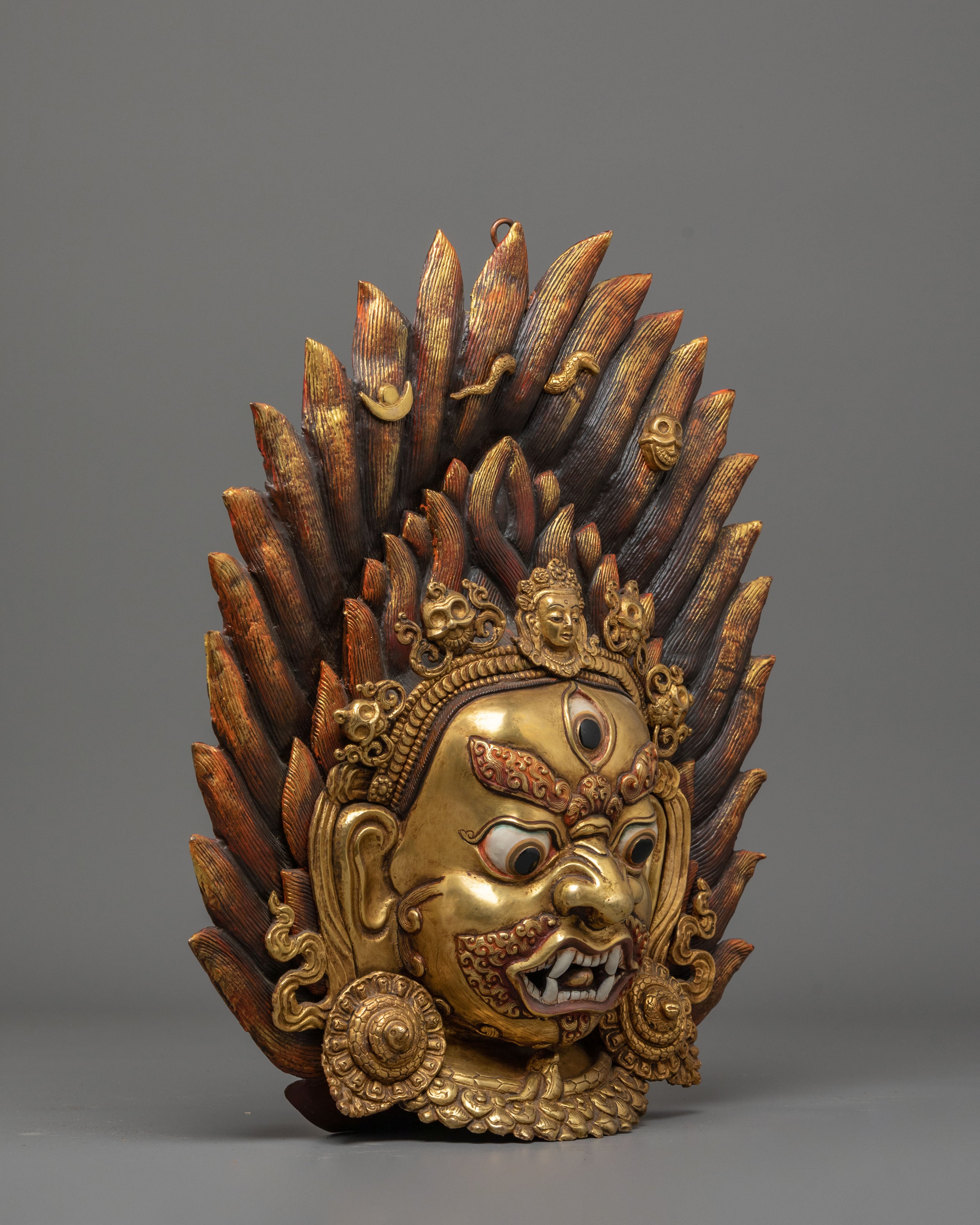 Every aspect of this wall hanging demonstrates intricate creativity and spiritual depth. The fire halo over Mahakala's head denotes cleansing and the burning away of barriers, while his three eyes represent omniscient vision, or the ability to perceive the past, present, and future. The ferocious countenance, complete with bared teeth and bulging eyes, symbolizes the transition of anger into enlightened consciousness. This sculpture, embellished with exquisite details such as flower crowns, serpents, and sacred ornaments, represents the essence of Tibetan metalwork by combining spiritual symbolism with artistic accuracy.