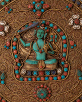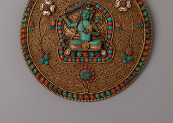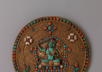 The wall hanging features delicate motifs—floral patterns, lotus shapes, and ornamental details—that surround the deity, creating a balanced, visually rich composition. The turquoise and coral stones enhance the warmth and depth of the design, giving the piece a radiant and captivating visual profile. The craftsmanship reflects cultural heritage while showcasing meaningful artistic expression rooted in Tibetan Buddhist tradition.