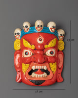 This authentic Tibetan Protective Deity Wall Mask represents one of the most powerful guardian spirits in Himalayan Buddhist tradition. Handcrafted from wood and painted with vibrant acrylic colors, this Buddhist wrathful deity mask features the characteristic fierce red face with bulging eyes, flaming eyebrows, and bared white fangs that symbolize the deity's power to ward off evil spirits and negative energies. The crown of five skulls adorning the top represents the transformation of the five poisons into wisdom, while the third eye on the forehead signifies omniscient awareness that sees through all illusions and protects devotees from harm.