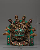 This handcrafted Turquoise Coral Wall Hanging Mask will bring heavenly energy into your sacred protection. This bold and detailed mask, 20cm wide and 17.5cm tall, shows powerful protective expressions commonly associated with wrathful deities in Himalayan spiritual traditions. Its brass body, set with Artificial turquoise and coral stones, produces a bright and magical aura, making it ideal for home altars, temple walls, and meditation places.