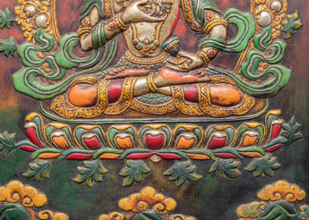 The Vajrasattva Wall Hanging is a potent symbol of purity, healing, and spiritual development. This beautiful piece, measuring 68cm in height and 53cm in width, showcases an elaborately sculpted clay sculpture mounted on a handcrafted oak frame. The brilliant acrylic hues provide depth and richness to Vajrasattva's tranquil face, making this piece an ideal addition to meditation rooms, temples, or sacred locations.