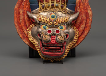 In Tibetan Buddhism, Yamantaka is revered as the remover of death and ignorance, guiding practitioners to enlightenment and inner change. His angry countenance, fiery aura, and magnificent crown, decorated with skulls, represent victory over evil forces and attachments. The exquisite workmanship on this handcrafted Yamantaka mask showcases both its spiritual significance and exceptional craftsmanship, making it a highly prized spiritual item among Vajrayana practitioners.