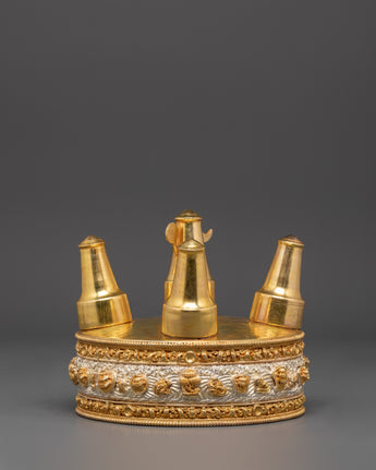 This torma is made of copper and plated in gold and silver. It has a beautifully detailed silver floral base. It measures 14.5 cm in height and 16.5 cm in width, weighs 0.84 kg, and serves both visual and spiritual purposes, making it an excellent addition to any ritual or shrine setup.