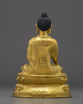 Gautama Buddha is depicted seated in padmasana on a lotus base, with his right hand in the bhumisparsha mudra (earth-touching gesture), symbolizing the moment of his enlightenment when he called the earth to witness his victory over Mara. His left hand rests gently in his lap, embodying meditation and spiritual balance. This pose reflects unwavering determination, awakening, and the triumph of wisdom over ignorance.