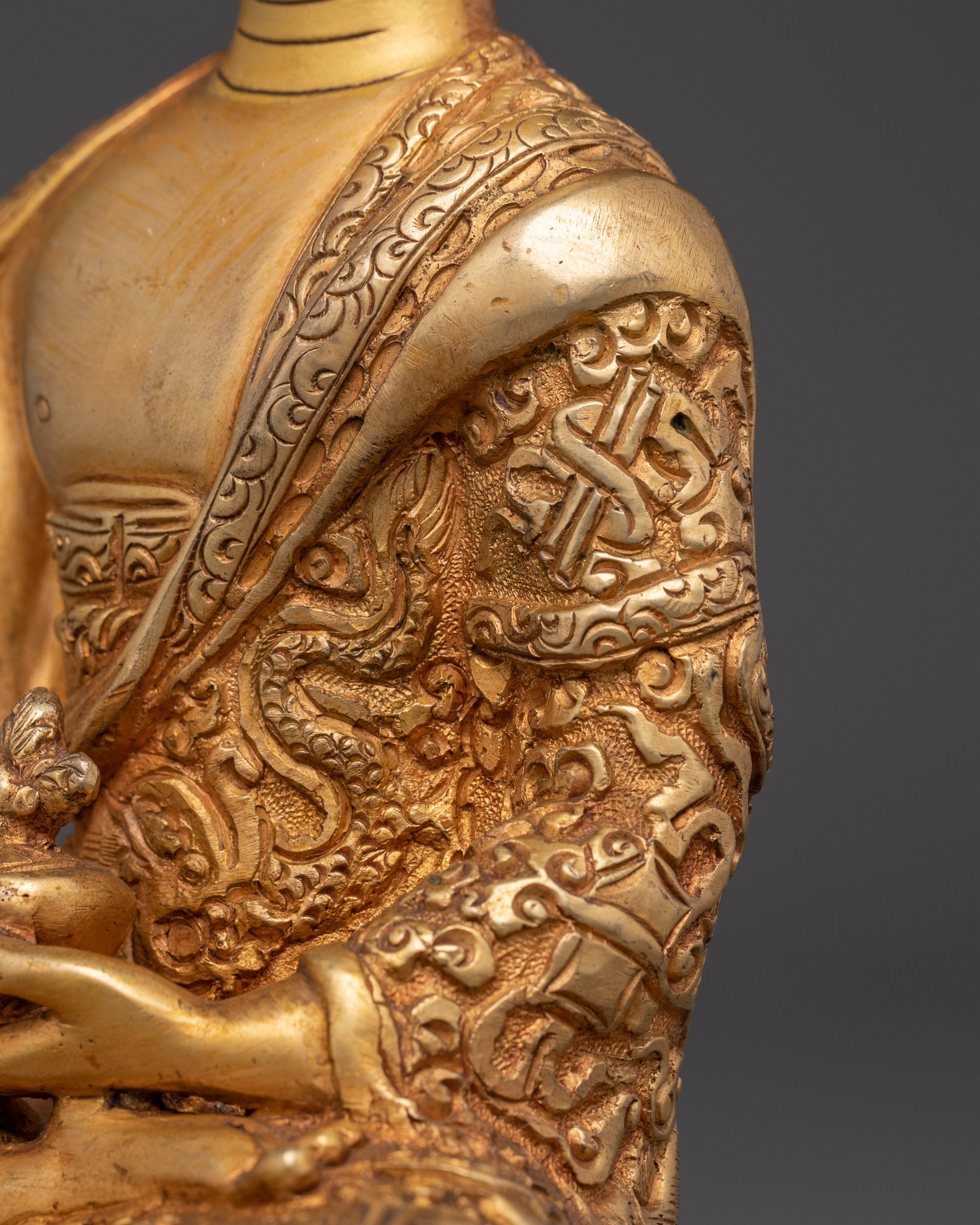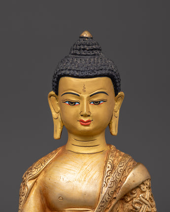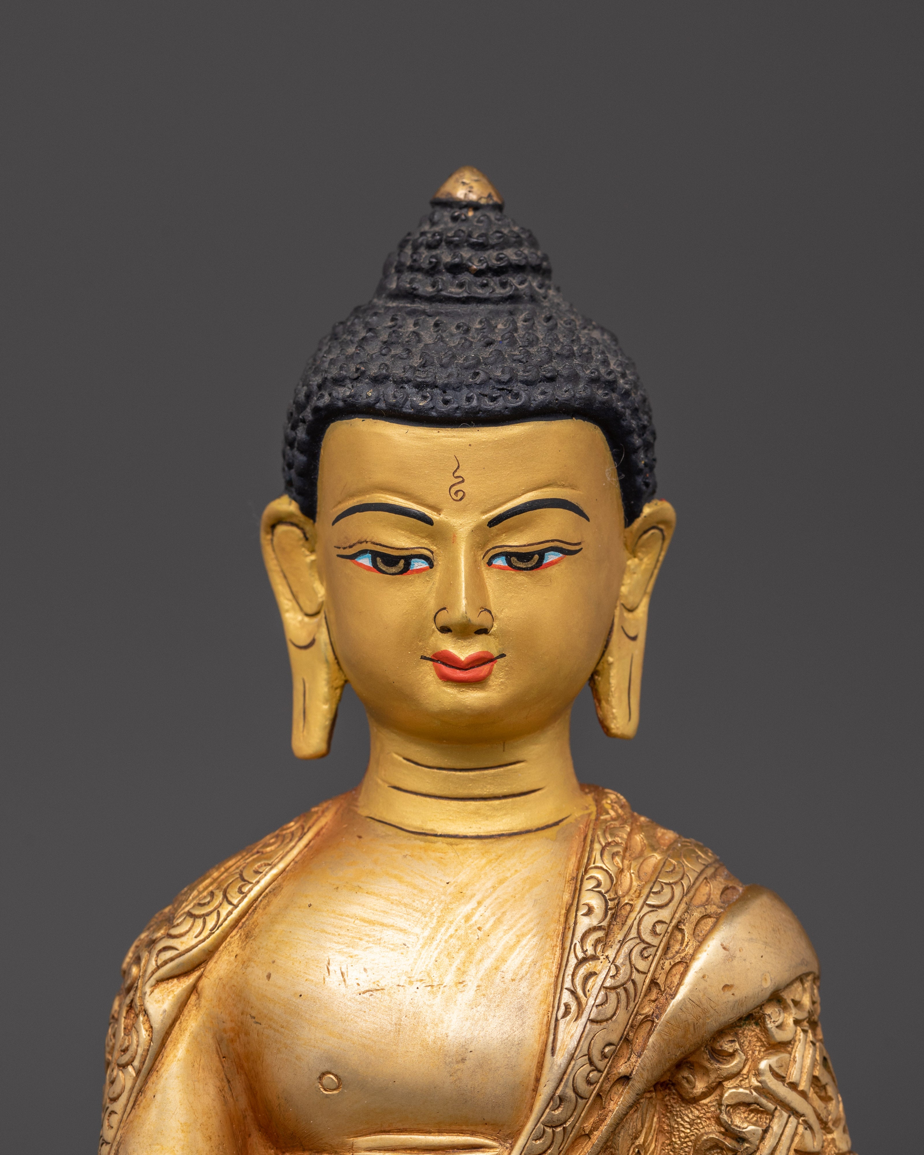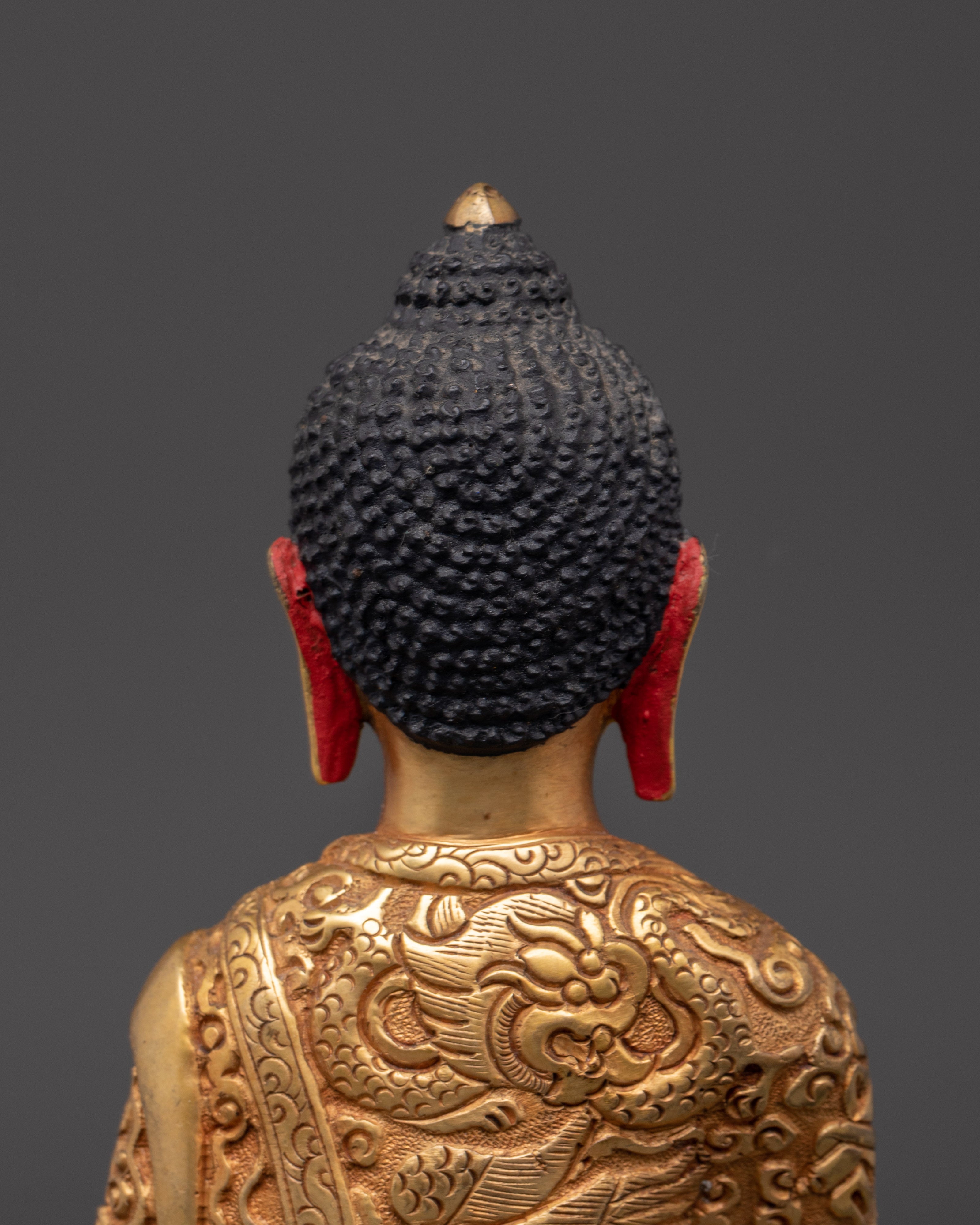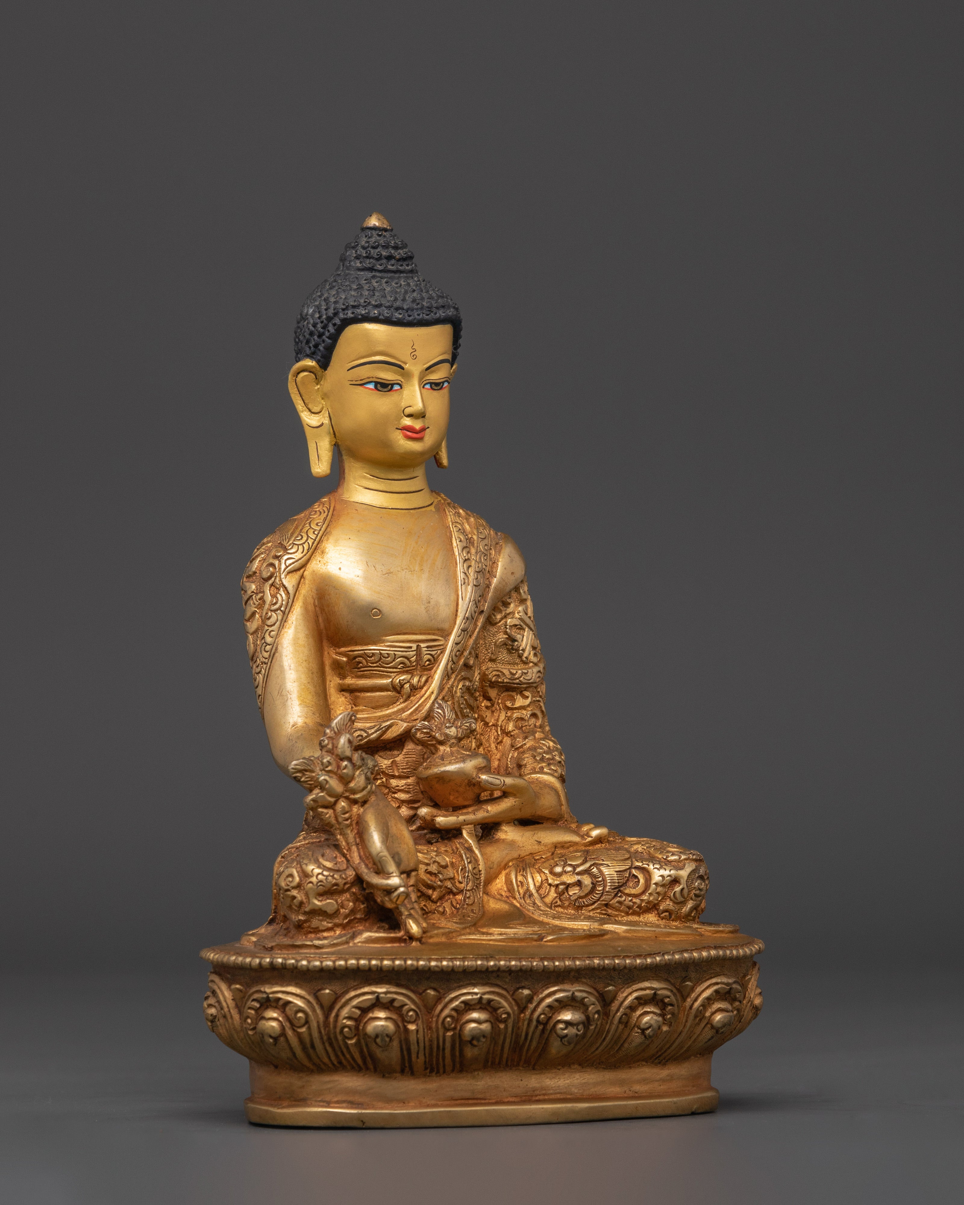Bhaisajyaguru, the Buddha of Healing, is usually invoked to promote physical, mental, and spiritual healing. In his left hand, he holds an alms bowl said to contain a healing nectar capable of curing all suffering and illness, reflecting his power to heal both physical and spiritual wounds. This statue is both a religious item and an inspiring sculpture, encouraging meditation and spiritual progress. The gold plating not only adds to the statue's visual appeal but also ensures its longevity, making it a treasured heirloom or gift.