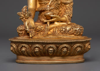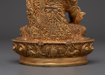 This Handcrafted Bhaisajyaguru Statue depicts the revered Medicine Buddha, who is recognized for his healing abilities and loving spirit. This handcrafted statue is made of copper and finished with beautiful gold plating, giving it an attractive and spiritual appearance. This statue, which is 21 cm tall and 14 cm wide, is ideal for placement on altars, meditation rooms, or holy areas to promote well-being, calm, and spiritual clarity. The elaborate decorations on the robe and lotus base show the superb craftsmanship that went into creating this magnificent figure.