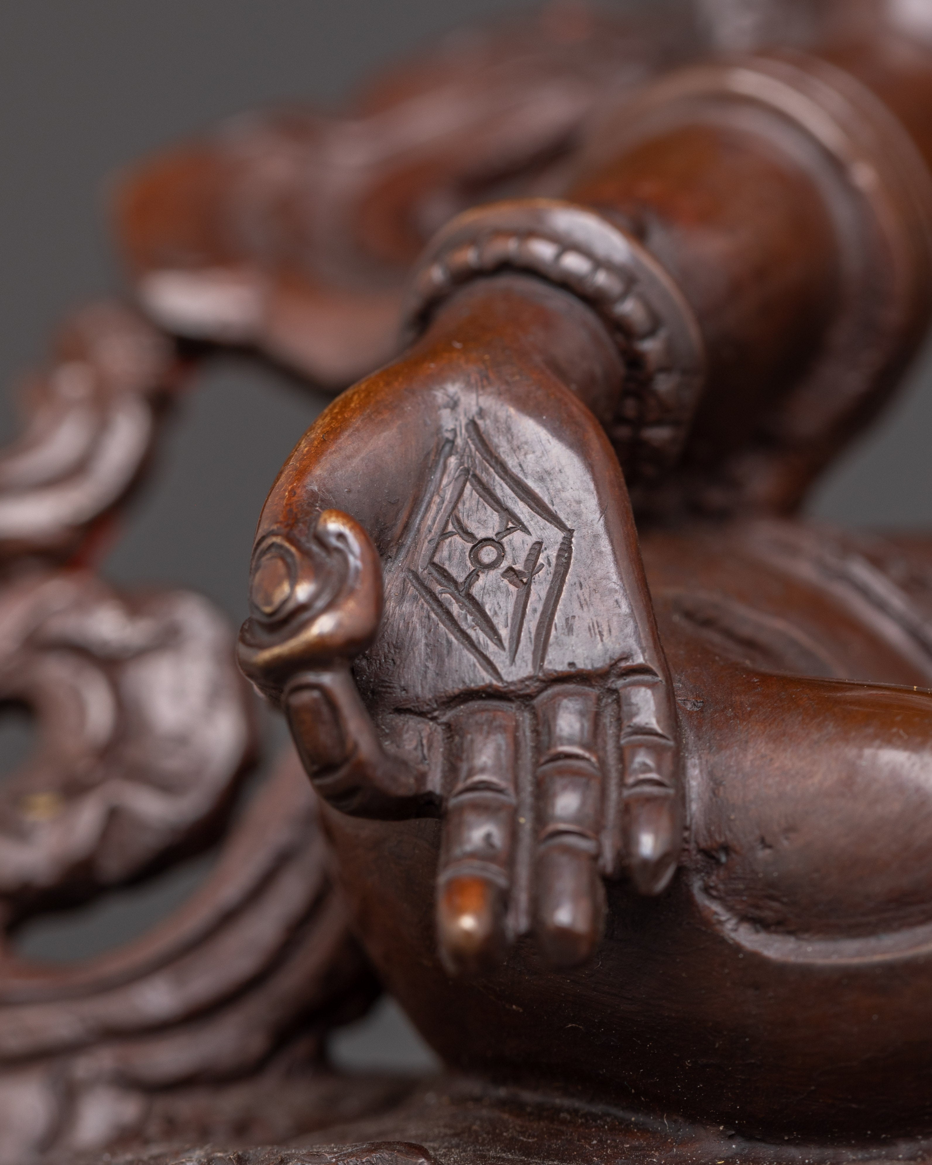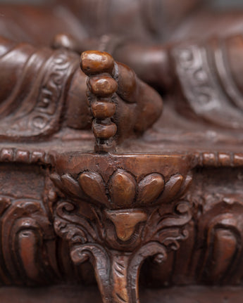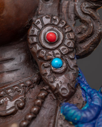 The Handmade Mother Green Tara (Shyama Tara) Statue, also known as the Swift Liberator, measures 8.3”/21cm in height and 6.5”/16.5cm at the base, weighing 1.32 kg. Expertly crafted from oxidized copper, it features detailed acrylic paintings that enhance its serene presence. Representing the embodiment of active compassion and swift protection, this statue is perfect for altars, meditation spaces, or as a meaningful spiritual gift. Its fine craftsmanship reflects traditional Nepali artistry, making it a powerful and beautiful addition to any devotional setting.