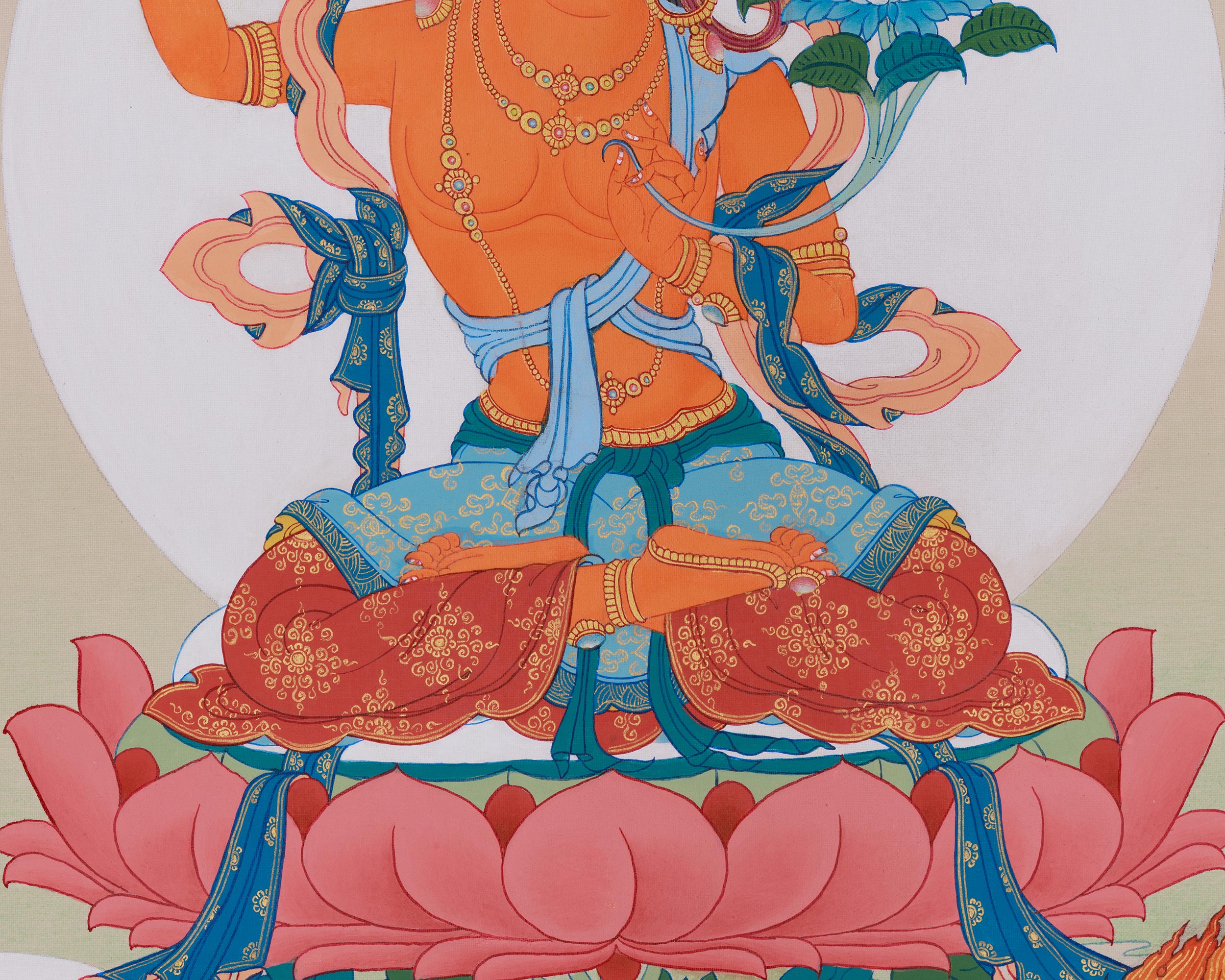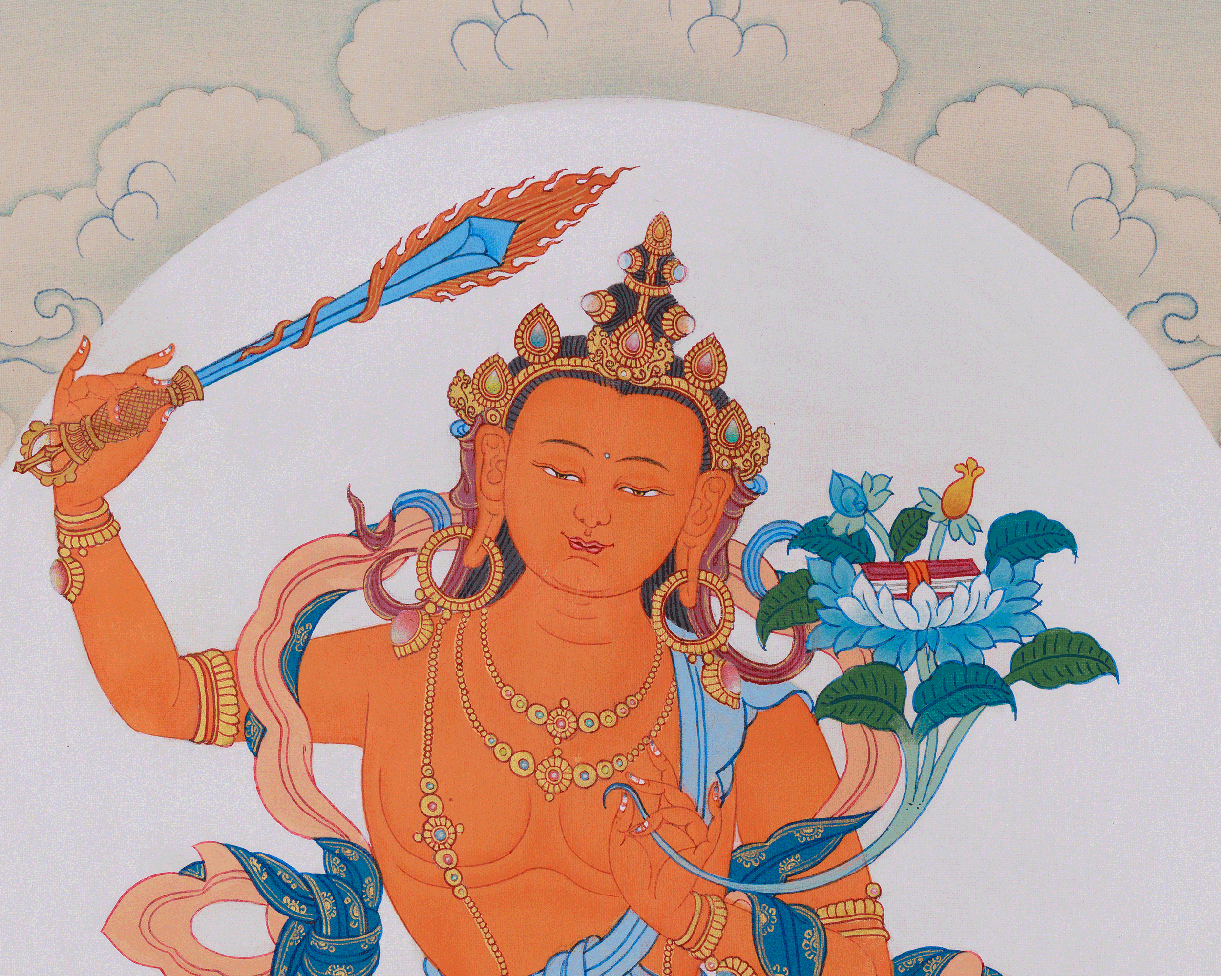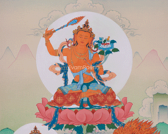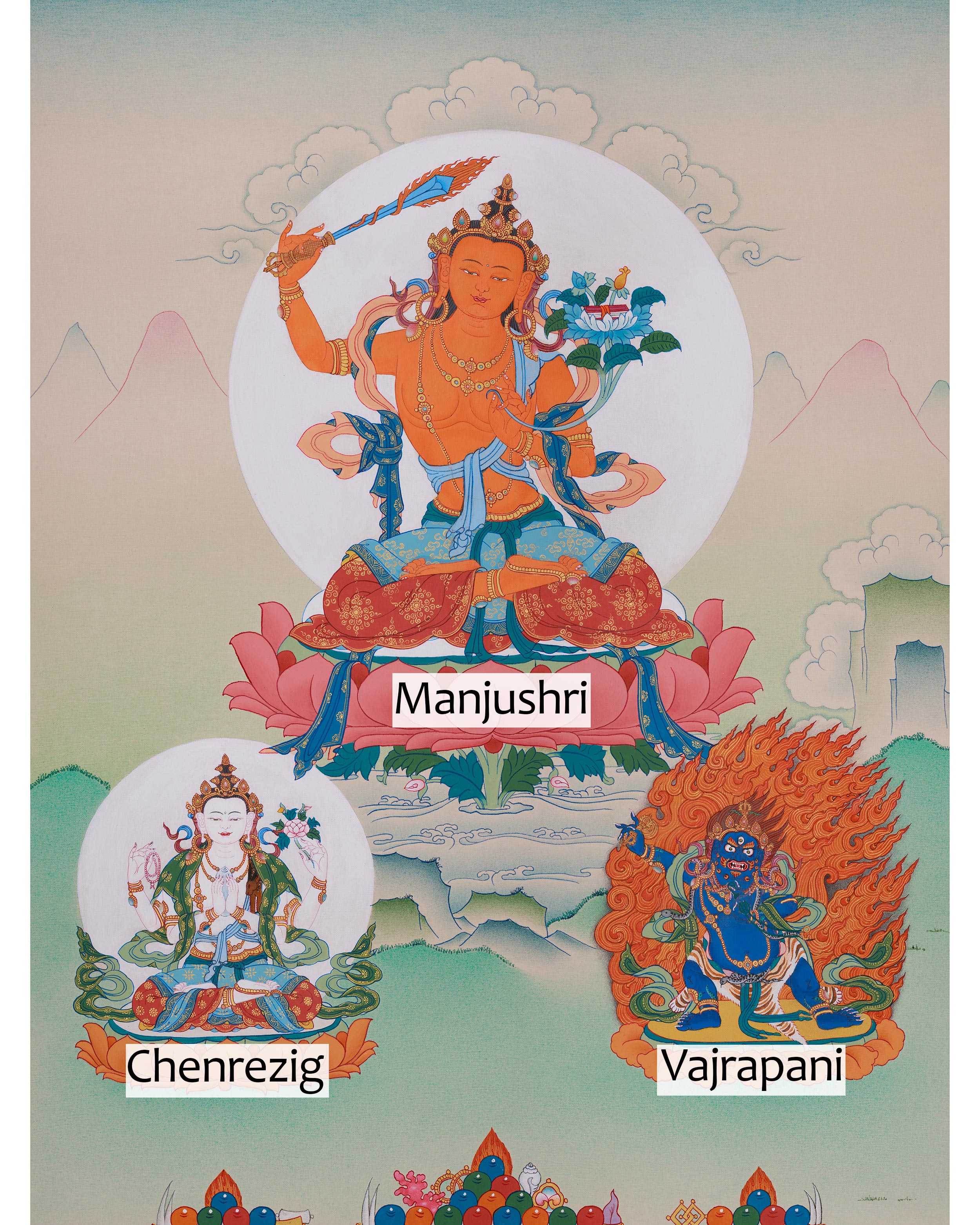 Original Manjushri with Chenrezig and Vajrapani Thangka | The Bodhisattvas of Wisdom, Compassion, and Power, Surrounded by Sacred Offerings and Symbols of Enlightenment