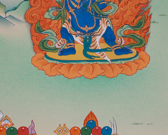 The Three Bodhisattvas, Manjushri with Chenrezig and Vajrapani, represent the fundamental principles of Mahayana Buddhism: wisdom, compassion, and enlightened action. This thangka beautifully depicts these notable figures, inspiring practitioners to embody these virtues daily and in their spiritual pursuits. Serving as a tool for consciousness, the artwork effectively illustrates the harmony of divine qualities.