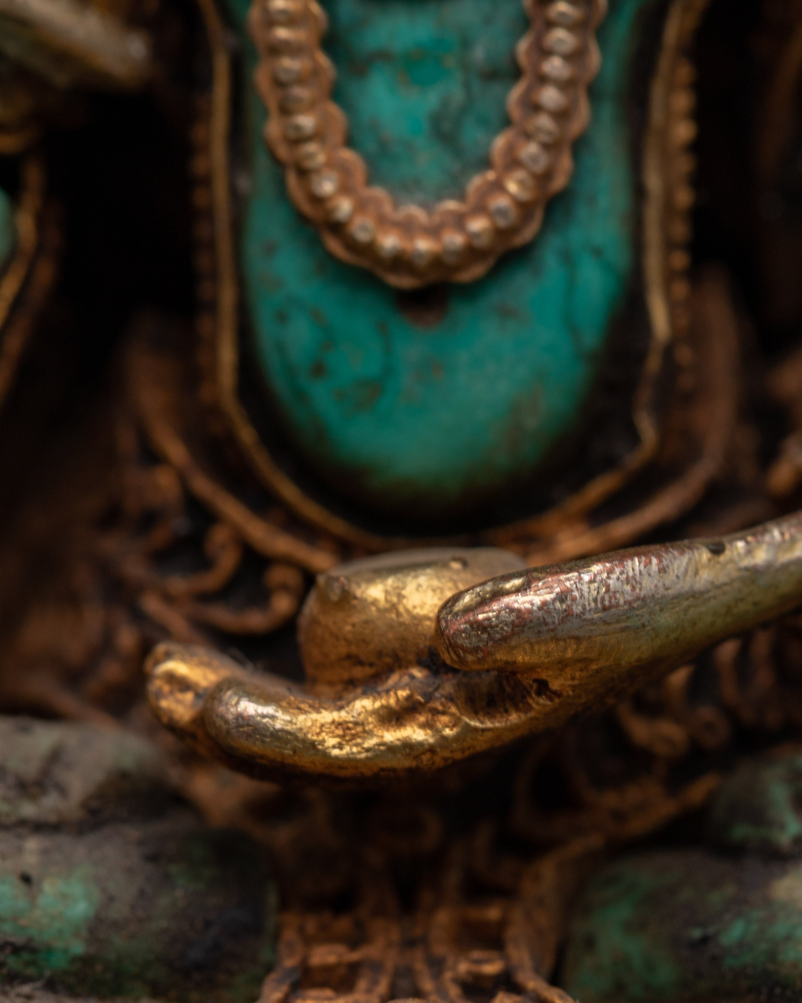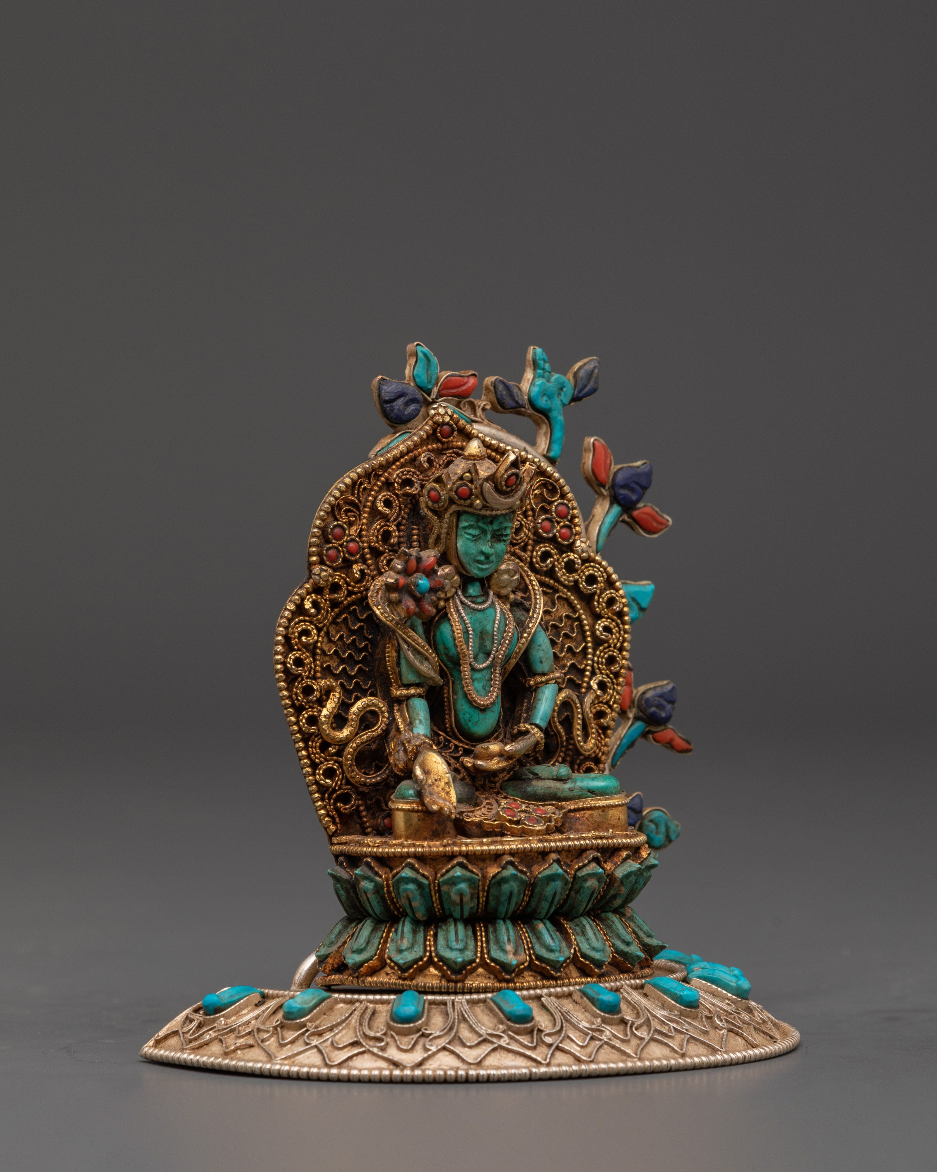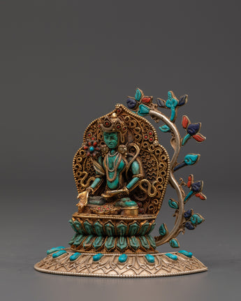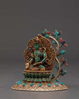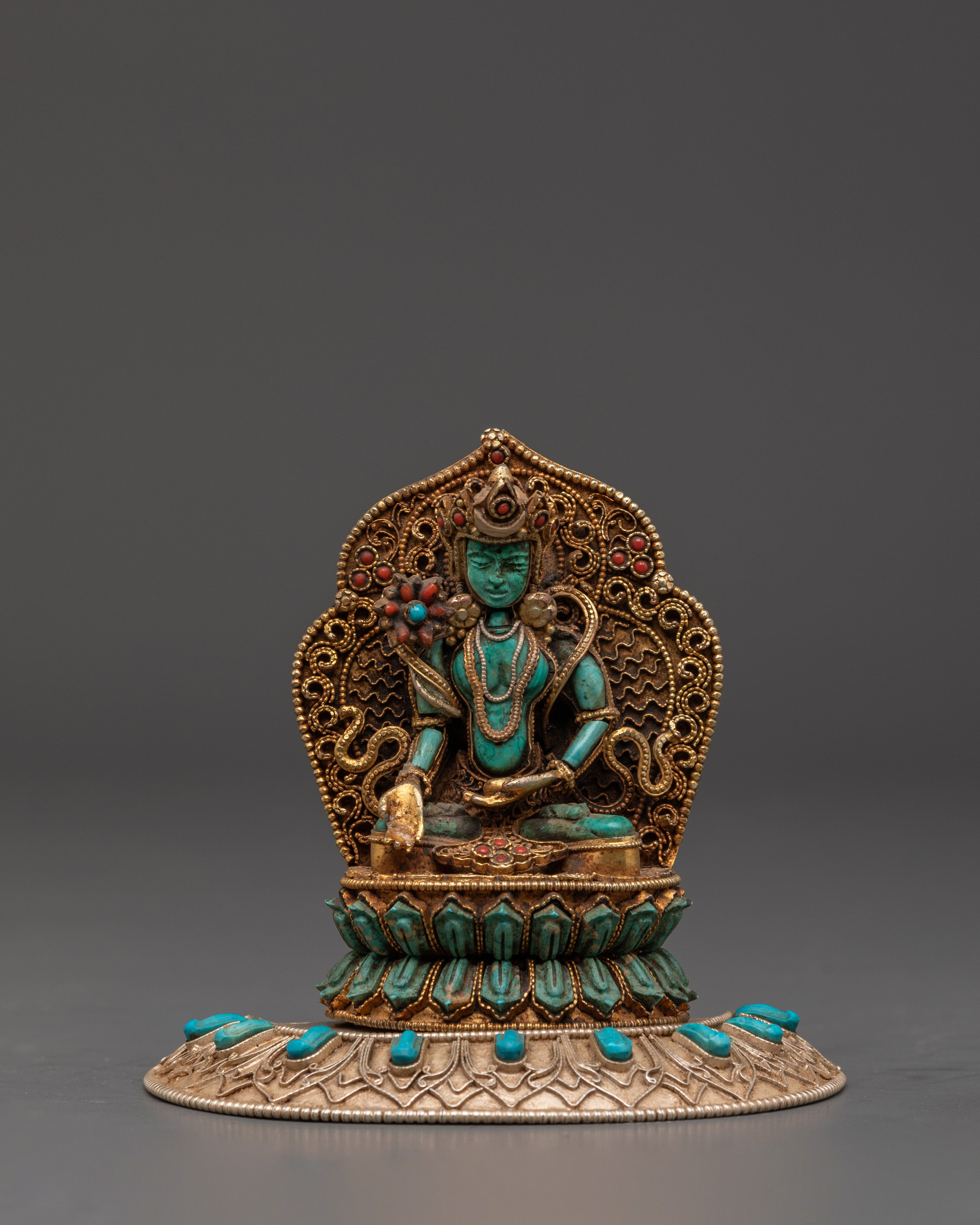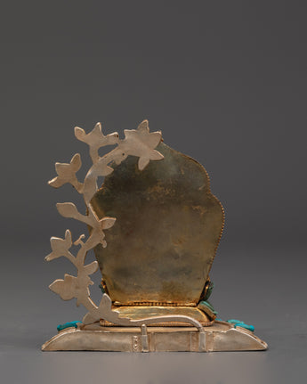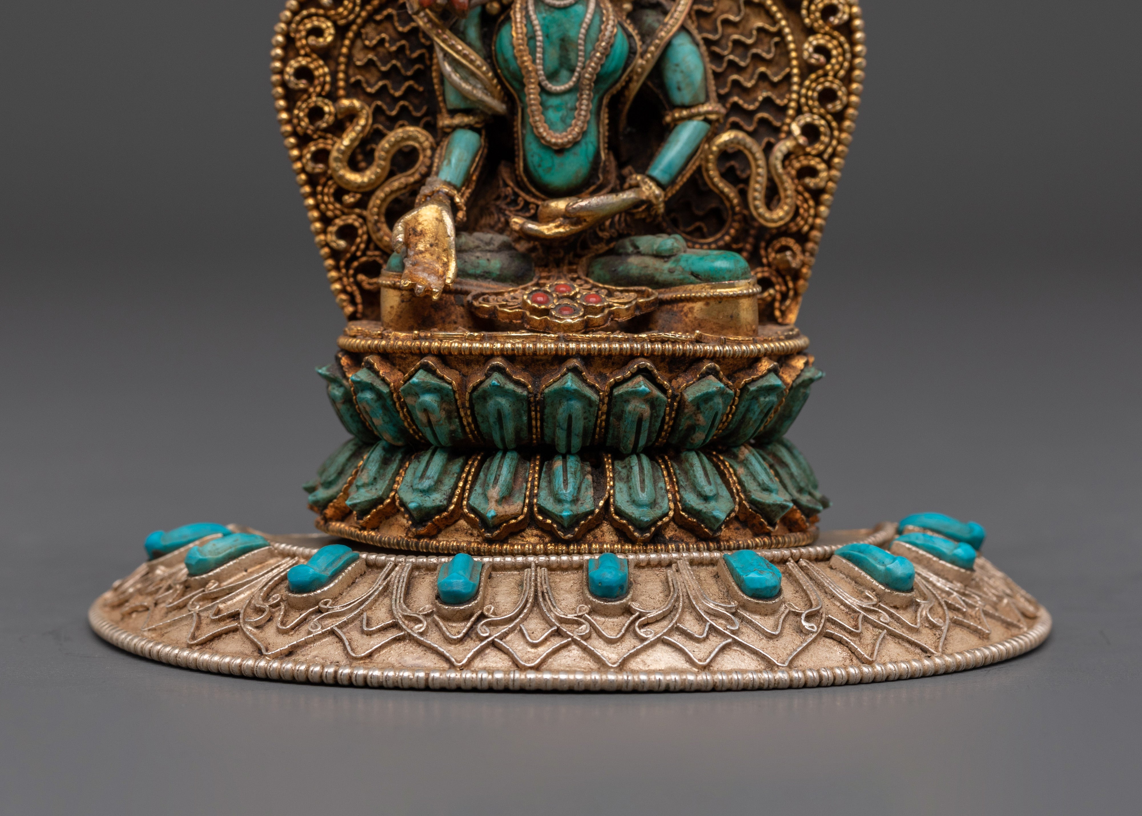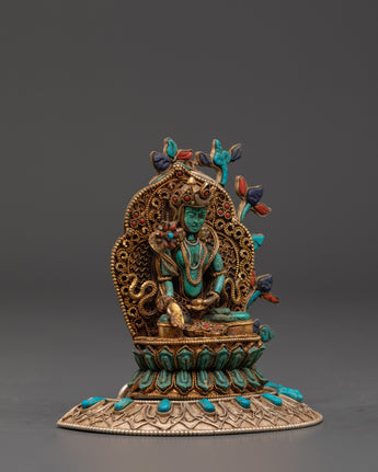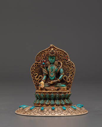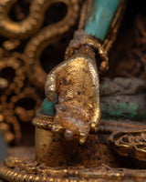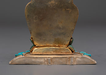The Ratnasambhava statue is meticulously crafted, with exquisite detailing and vibrant spiritual touches from lapis lazuli and turquoise stones. The gold-plated finish heightens the statue's regal presence, making it a valuable spiritual item in any setting. Whether employed during meditation or exhibited as a centerpiece, this Ratnasambhava Buddha statue is a continuous reminder of the path to enlightenment and the strength of wisdom to conquer life's challenges. This Ratnasambhava meditation statue is more than just a decorative item—it is a spiritual tool that encourages meditative focus and promotes mental clarity. By placing it in your home or meditation room, you invite the healing energy and wisdom of Ratnasambhava, creating a sanctuary of peace and balance.