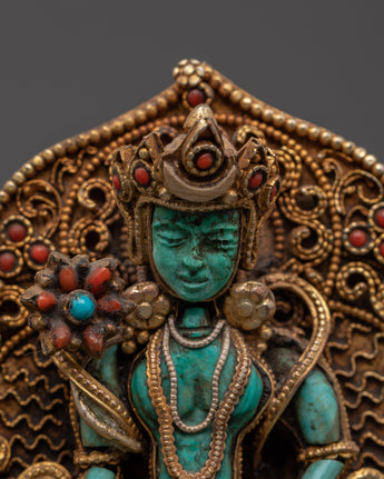 Introducing the Ratnasambhava Meditation Statue, a stunning handcrafted sculpture that reflects the essence of knowledge and tranquillity. This Buddha of Wisdom stands 12.5 cm tall and 12 cm wide, and is intricately constructed with copper and gold plating, as well as precious lapis lazuli and turquoise stones. Ratnasambhava, also known as the Buddha of Wisdom and Wealth, is a famous figure in Buddhist iconography who represents generosity, wisdom, and equanimity. This statue is an excellent addition to your meditation space, altar, or home décor to promote inner peace and spiritual development.