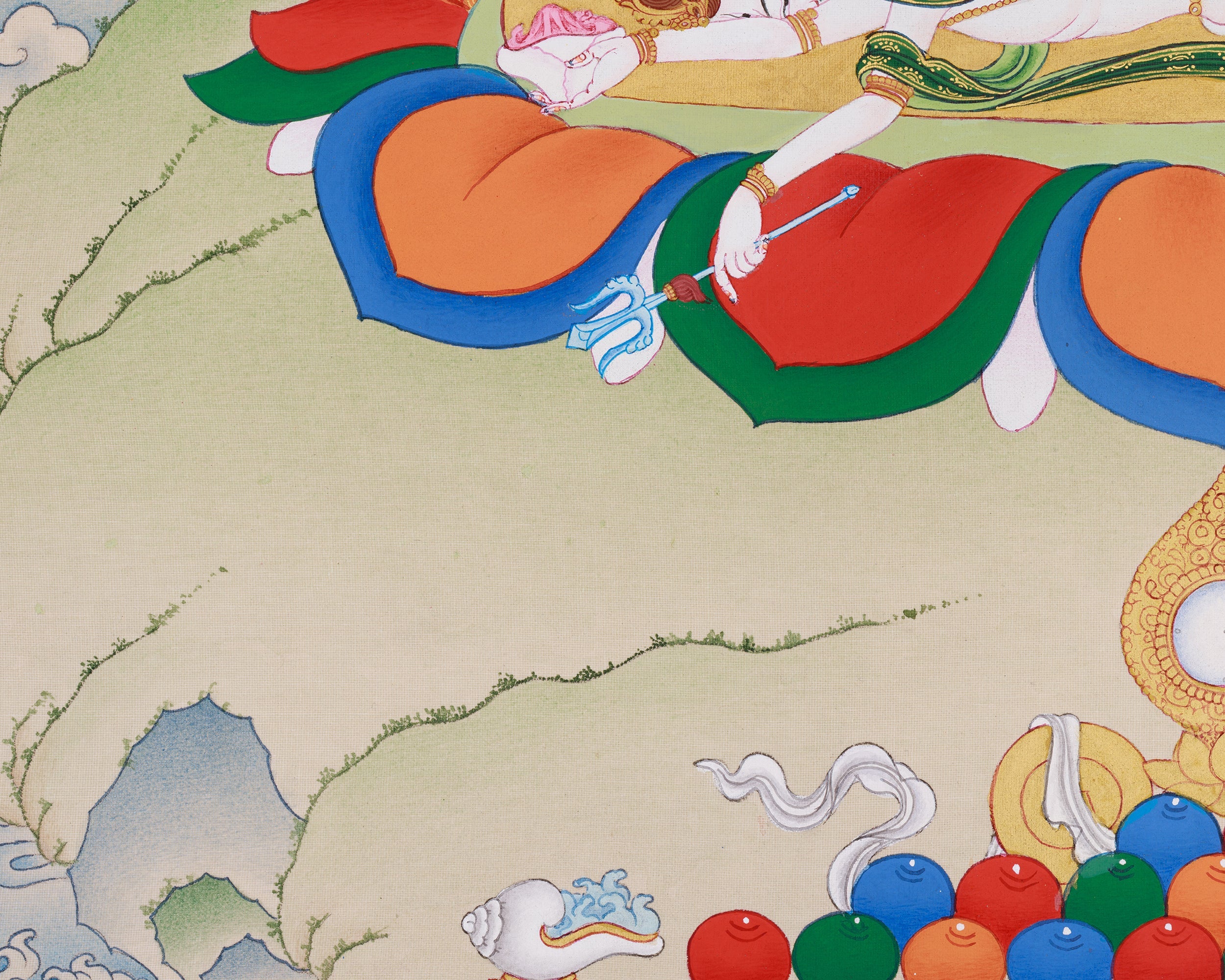 The Butadamara, a Buddhist Guardian thangka, is meticulously hand-painted on refined cotton canvas utilizing natural stone pigments and authentic 24K gold. The color palette introduces a subtle vibrancy connected to terrestrial energies, while the gold embellishments accentuate Vajrapani’s divine radiance. Created in the traditional Karma Gadri style, renowned for its intricate linework, luminous composition, and tranquil spatial configuration, it seamlessly combines artistic mastery with spiritual profundity. Each brushstroke reflects meticulous devotion and precision, embodying genuine Himalayan craftsmanship and sacred artistry.