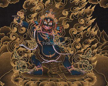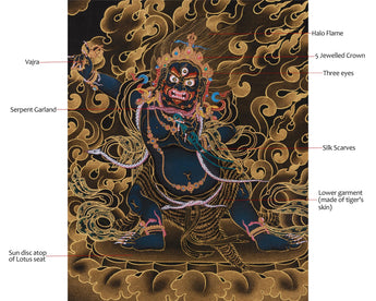 Vajrapani is a key figure in Tibetan Buddhism, serving as the Buddha's protector and symbolizing both strength and compassion. His name means “holder of the thunderbolt,” reflecting his power to eliminate ignorance and negativity using his vajra (thunderbolt). Usually depicted as a wrathful deity, Vajrapani embodies transformative force—turning obstacles into chances for spiritual growth. He is regarded as a guardian of the Dharma, shielding practitioners from harm and helping them overcome inner demons such as ignorance and desire.