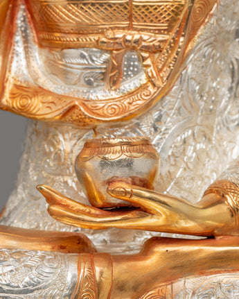 This Shakyamuni Buddha statue, known as the "Sage of the Shakya Clan," portrays the historical Buddha in a moment of serene enlightenment beneath the Bodhi tree. He represents purity and spiritual awakening in the Vajra posture (Padmasana) on a lotus base. His right hand is extended toward the earth in the Bhumisparsha Mudra, inviting the world to witness his enlightenment. His left hand holds an alms bowl in his lap, symbolising renunciation. The ushnisha atop his head signifies wisdom, and the spiral curls covering his head are said to represent the snails that protected him from the scorching sun during his meditation—an emblem of selfless devotion and nature’s reverence. His serene face reflects inner peace and deep meditation.