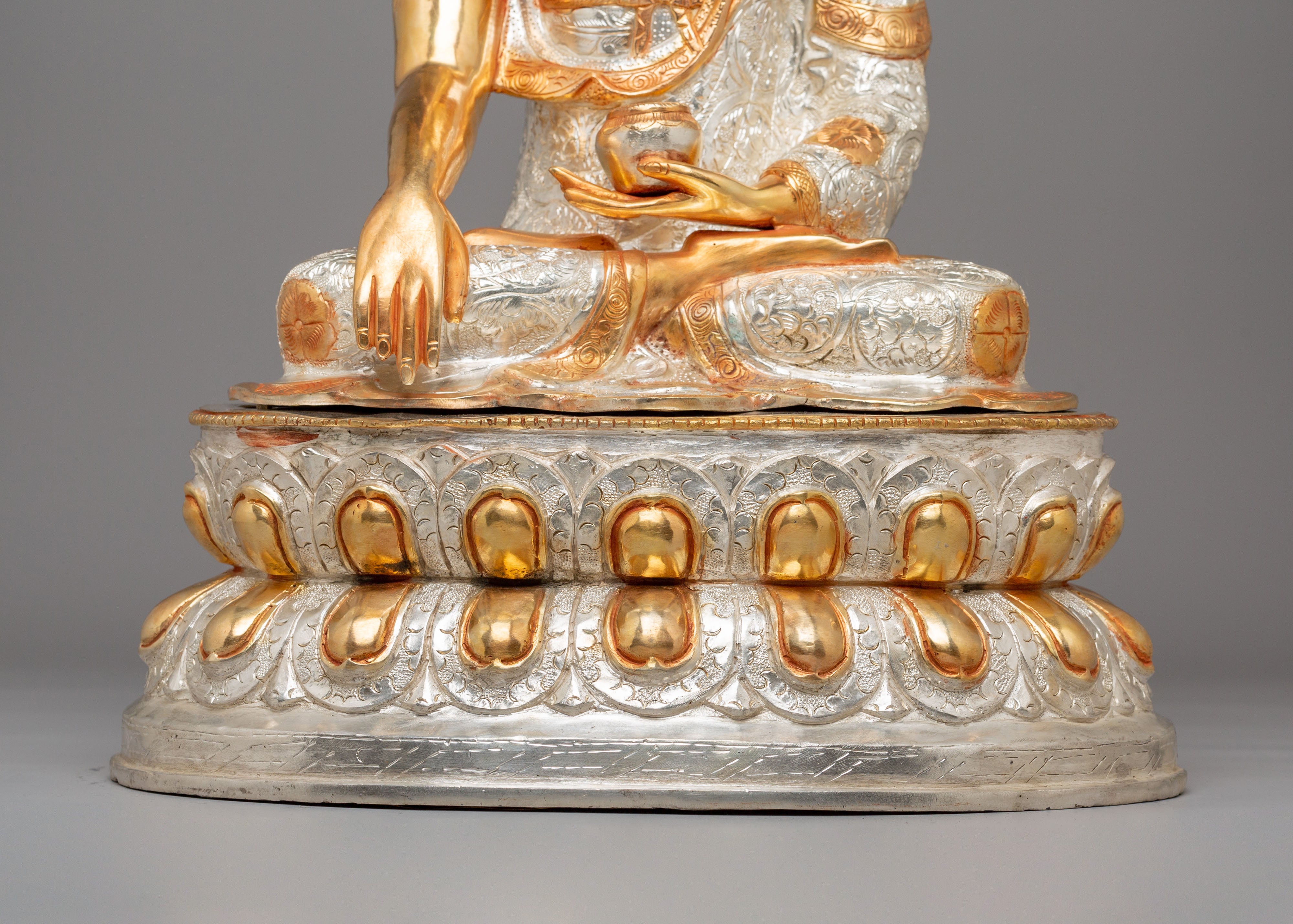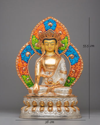 This Buddhist Crown Shakyamuni Buddha Statue, crafted from copper and plated in 24K gold, electro-gold, and silver, is a beautiful and spiritual piece of art. It measures 55.5 cm in height and 38 cm in width, weighing 9.81 kg. The intricate detailing and craftsmanship make it an ideal addition to any sacred space or meditation altar. This statue serves as a powerful symbol of enlightenment and peace, bringing tranquility and positivity to your surroundings.