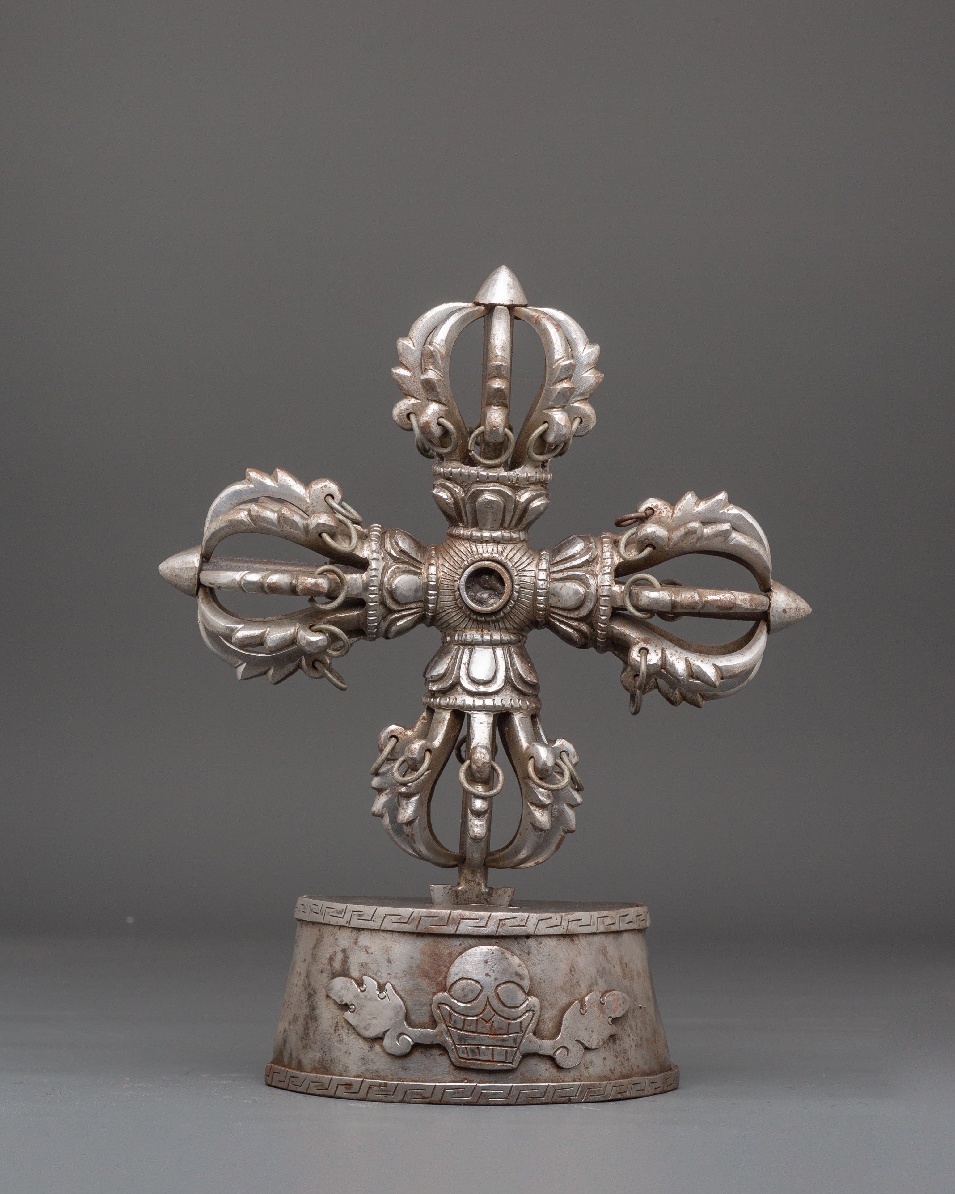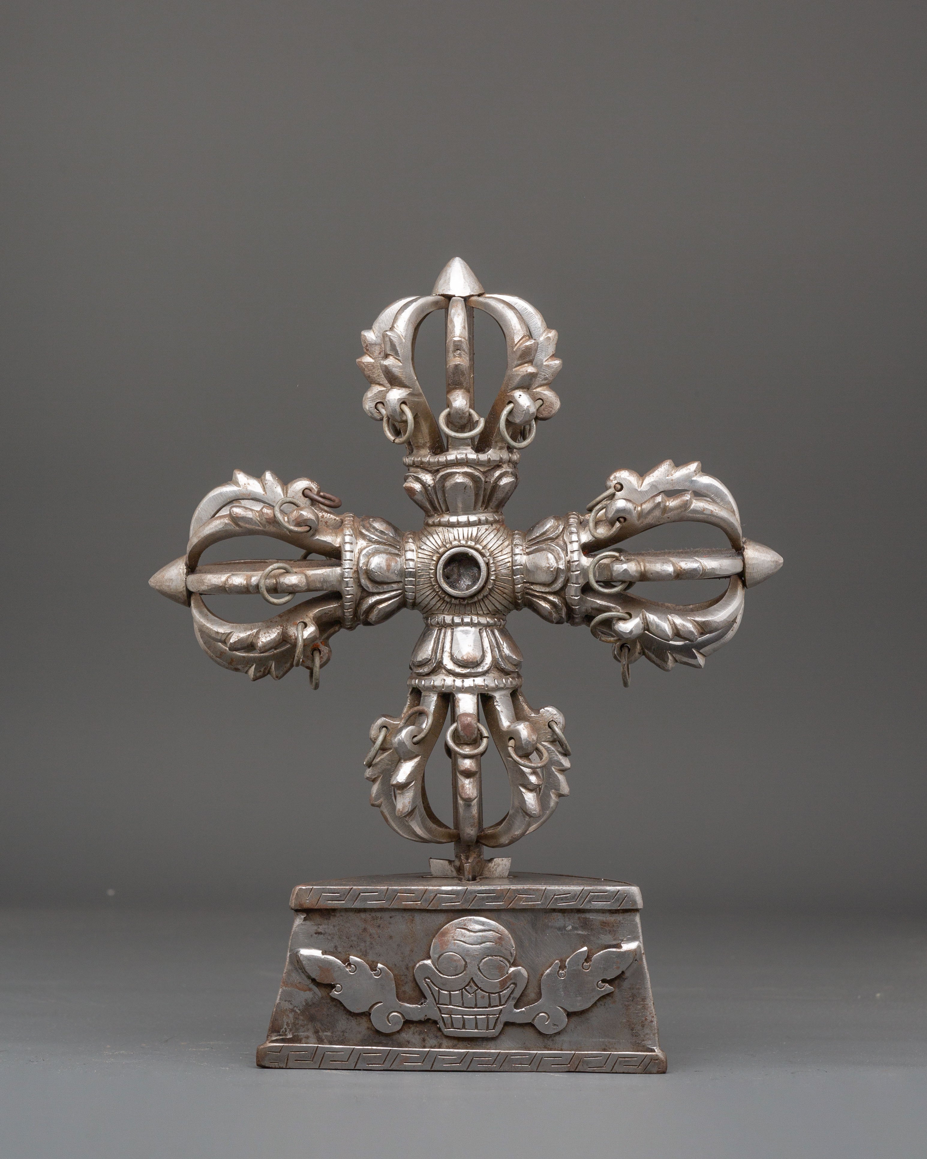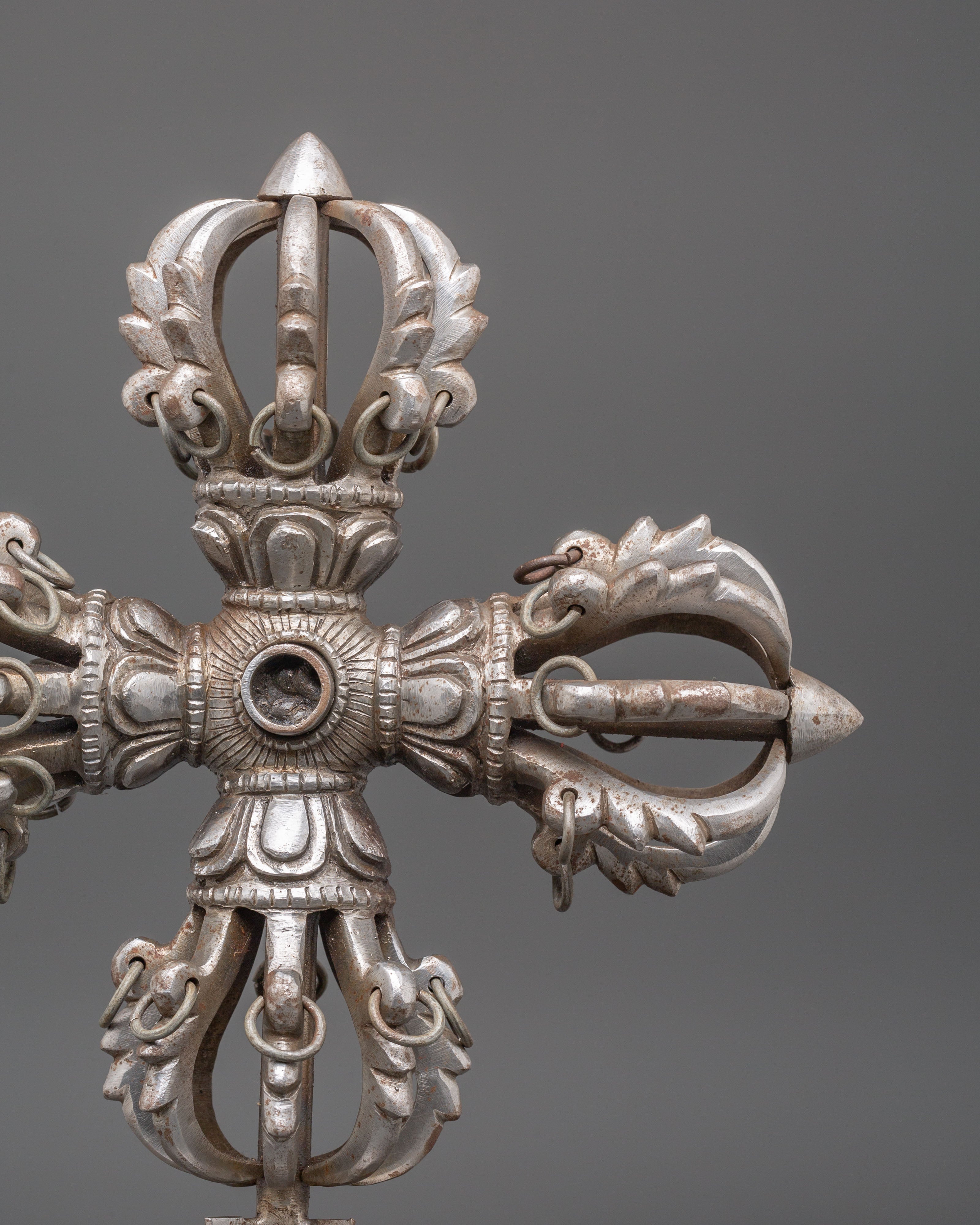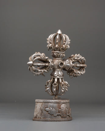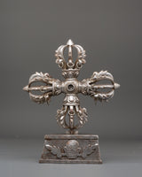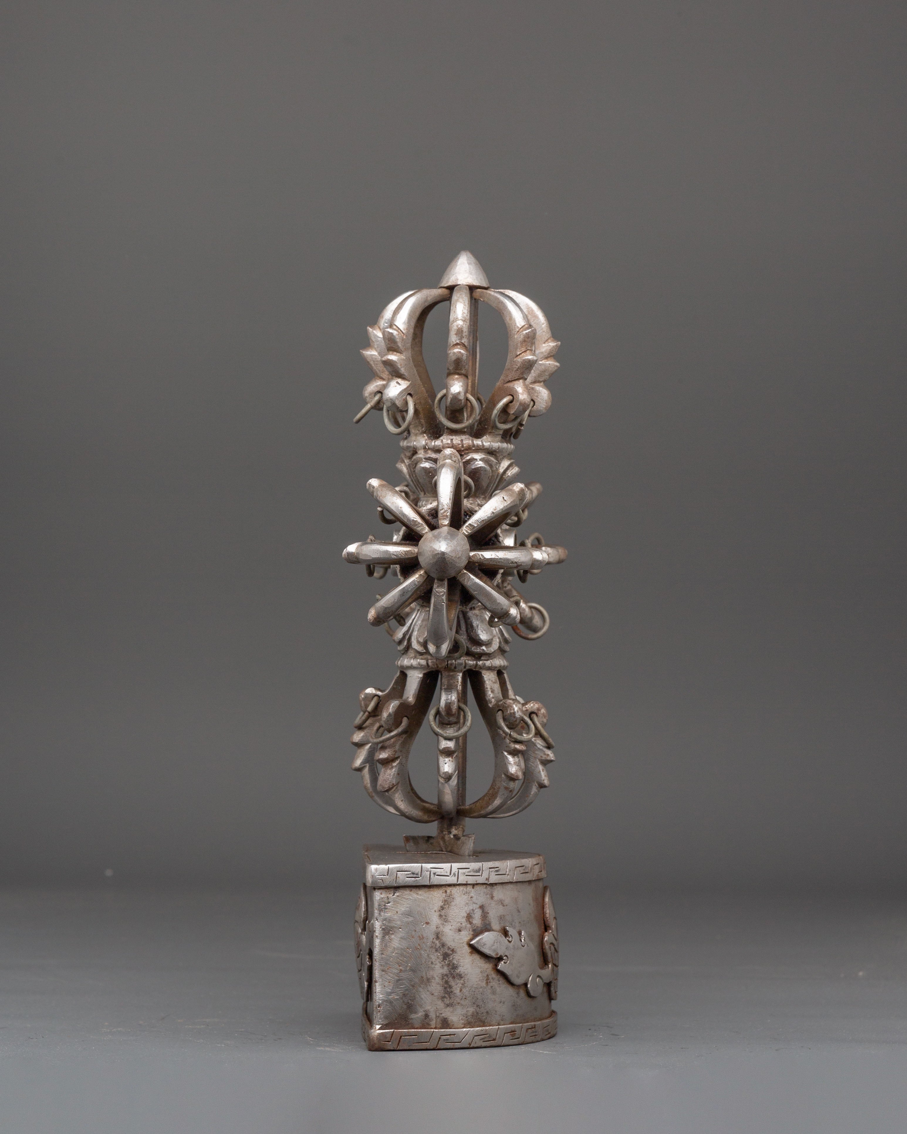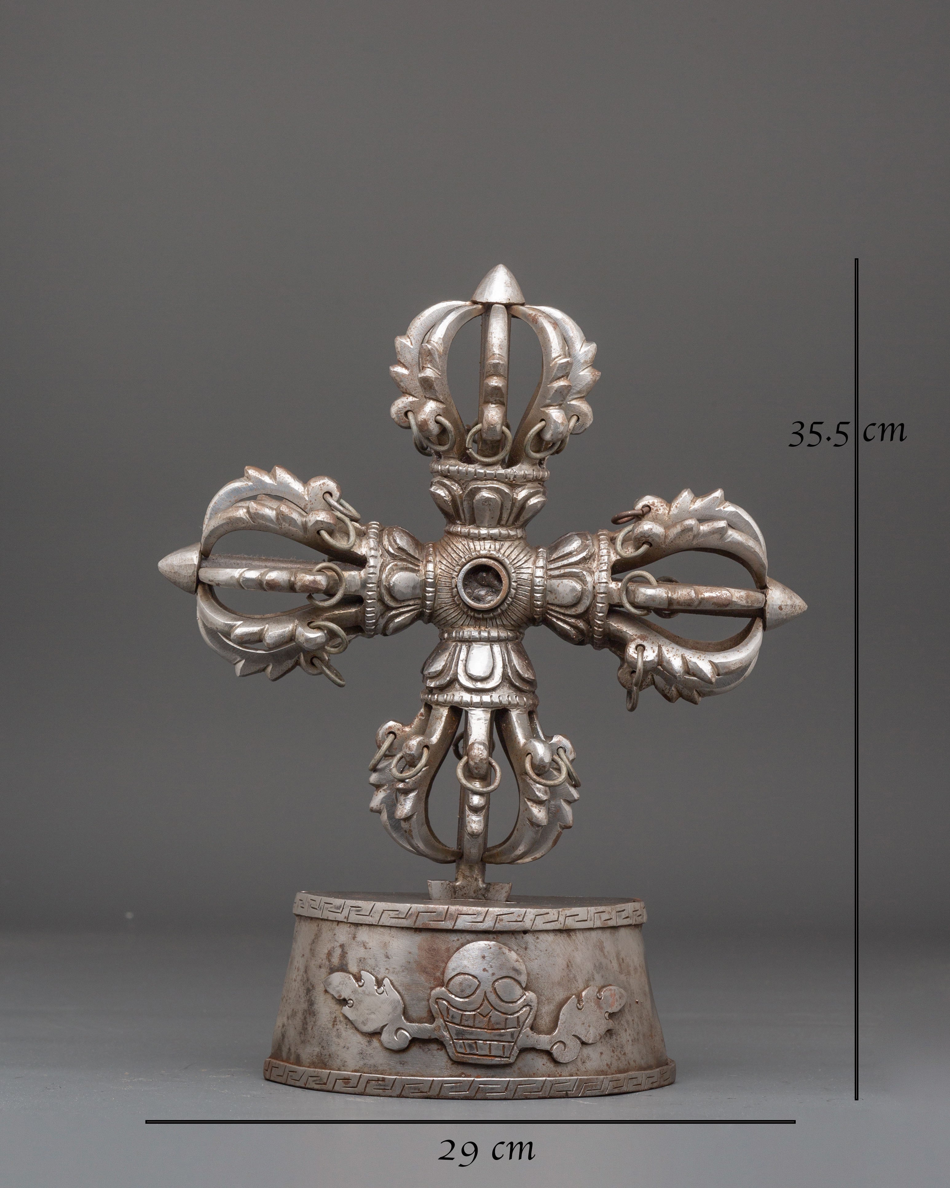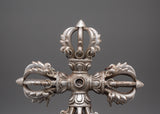 The design of the Vishwo Vajra features four interconnected vajras extending outward from a central hub, symbolizing the union of wisdom and compassion across the four cardinal directions. Each vajra head represents the unshakable truth of the Buddha’s teachings and the power to overcome ignorance and obstacles. The intricate detailing, including dragon-like motifs and sacred proportions, reflects traditional Tibetan craftsmanship and deep ritual significance. The iron construction enhances its symbolic strength, grounding spiritual energy and reinforcing its role as a protector of sacred space.