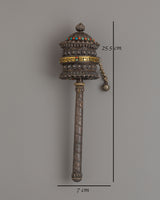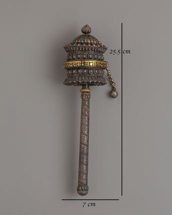 The Handcrafted Traditional Prayer Wheel is a beautiful and spiritual artifact designed to enhance any Buddhist altar, meditation space, or spiritual practice area. Made from a copper body and adorned with silver and artificial stones such as turquoise and coral, this prayer wheel captures the essence of Tibetan craftsmanship and sacred traditions. Measuring 25.5cm in height and 7cm in width, with a weight of 0.17kg, this prayer wheel is both portable and powerful, perfect for personal use or as a meaningful gift.