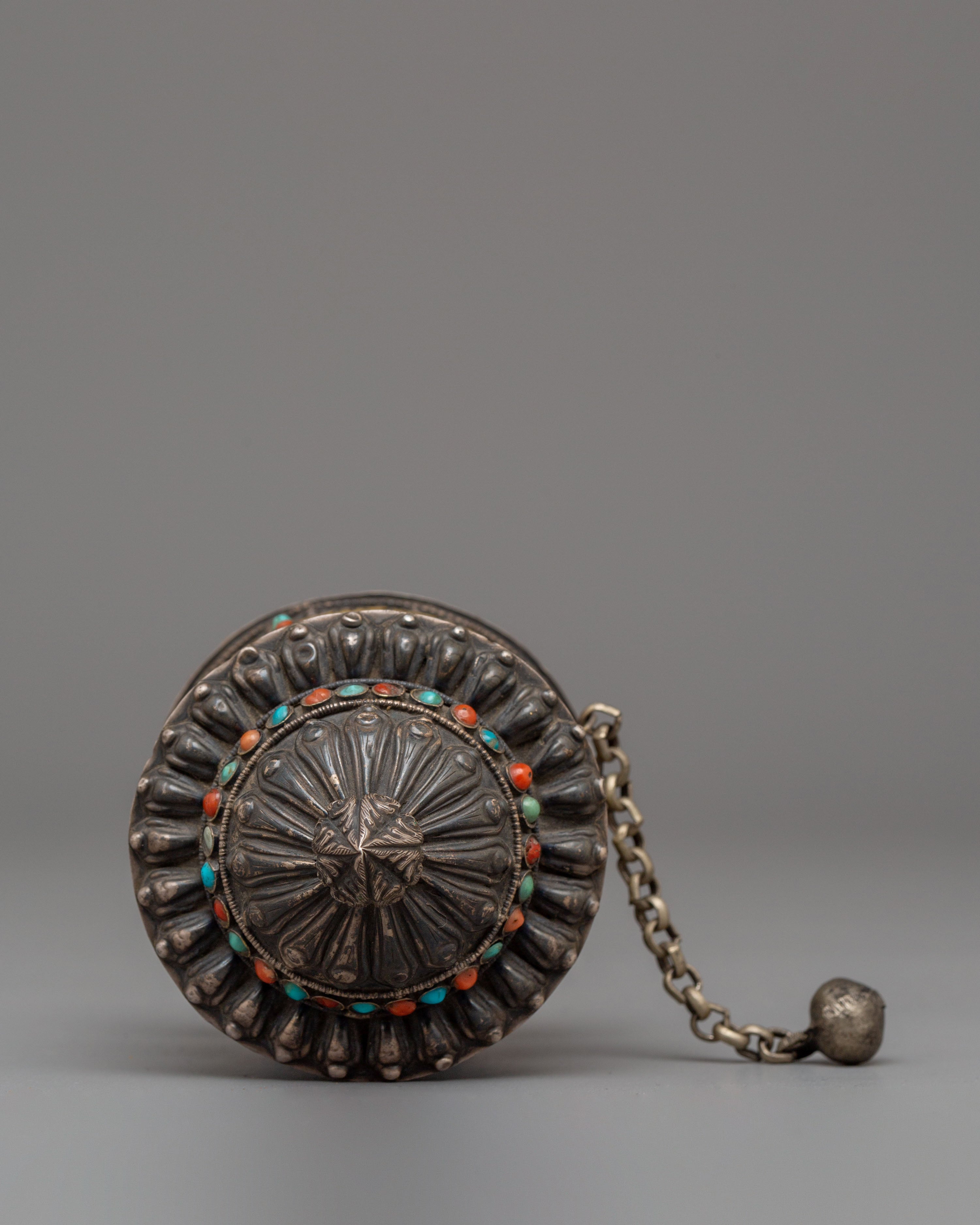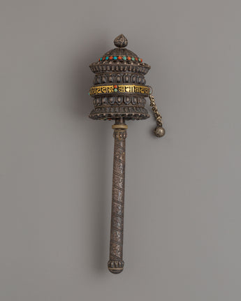 The prayer wheel is traditionally used in Buddhist rituals to invoke blessings, purify the mind, and spread the compassionate energy of mantras throughout the universe. The turquoise stones represent wisdom, while coral symbolizes life and vitality, making this prayer wheel not just a decorative item, but a spiritual tool. The silver accents complement the copper body, giving the wheel a radiant, timeless appearance that enhances its sacred function.