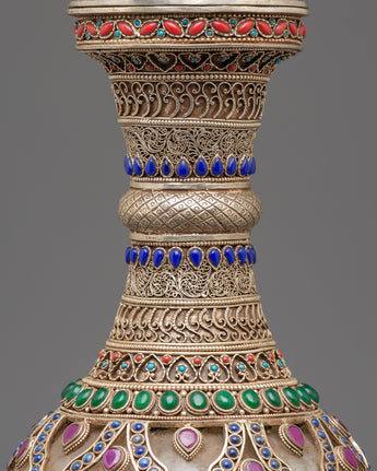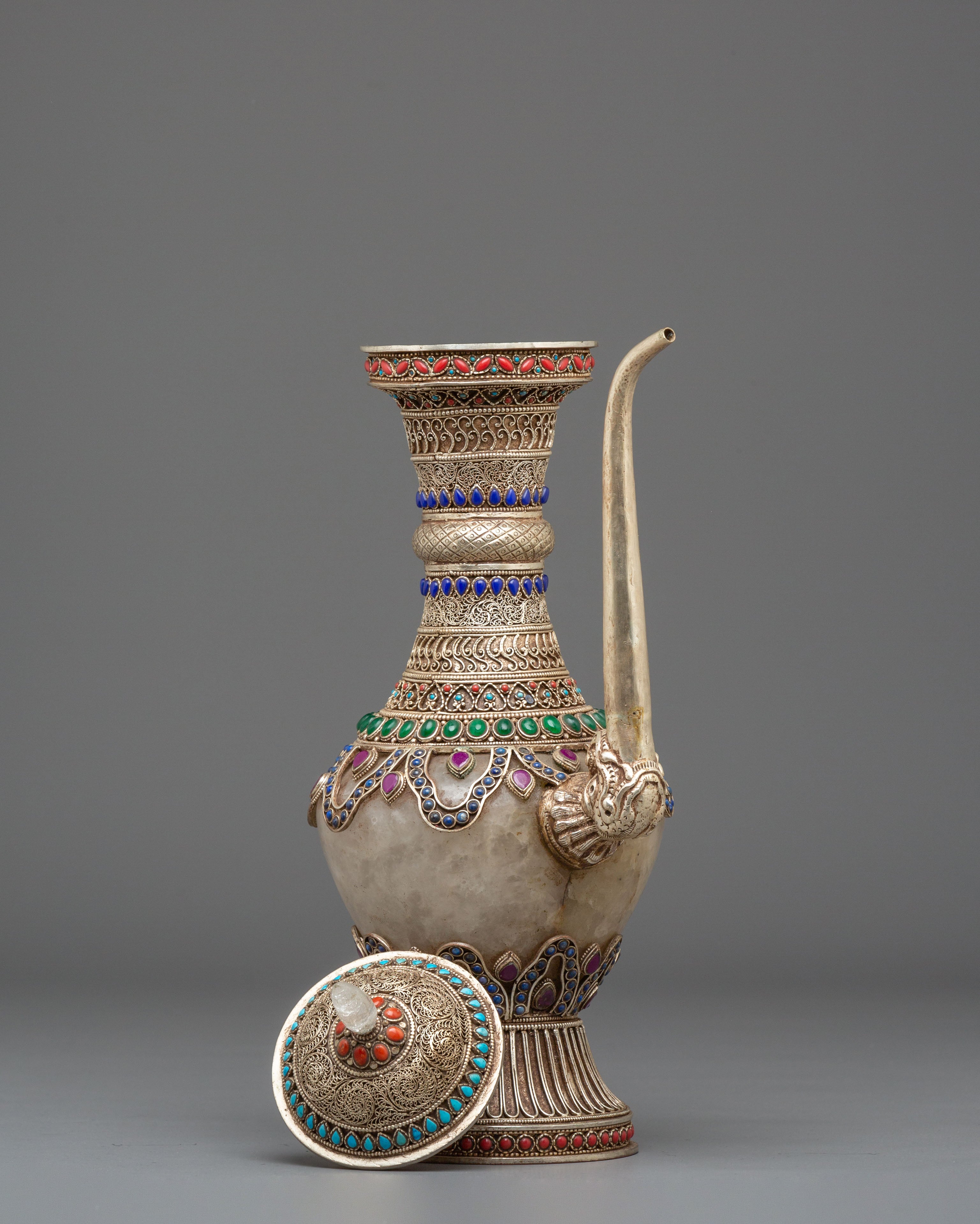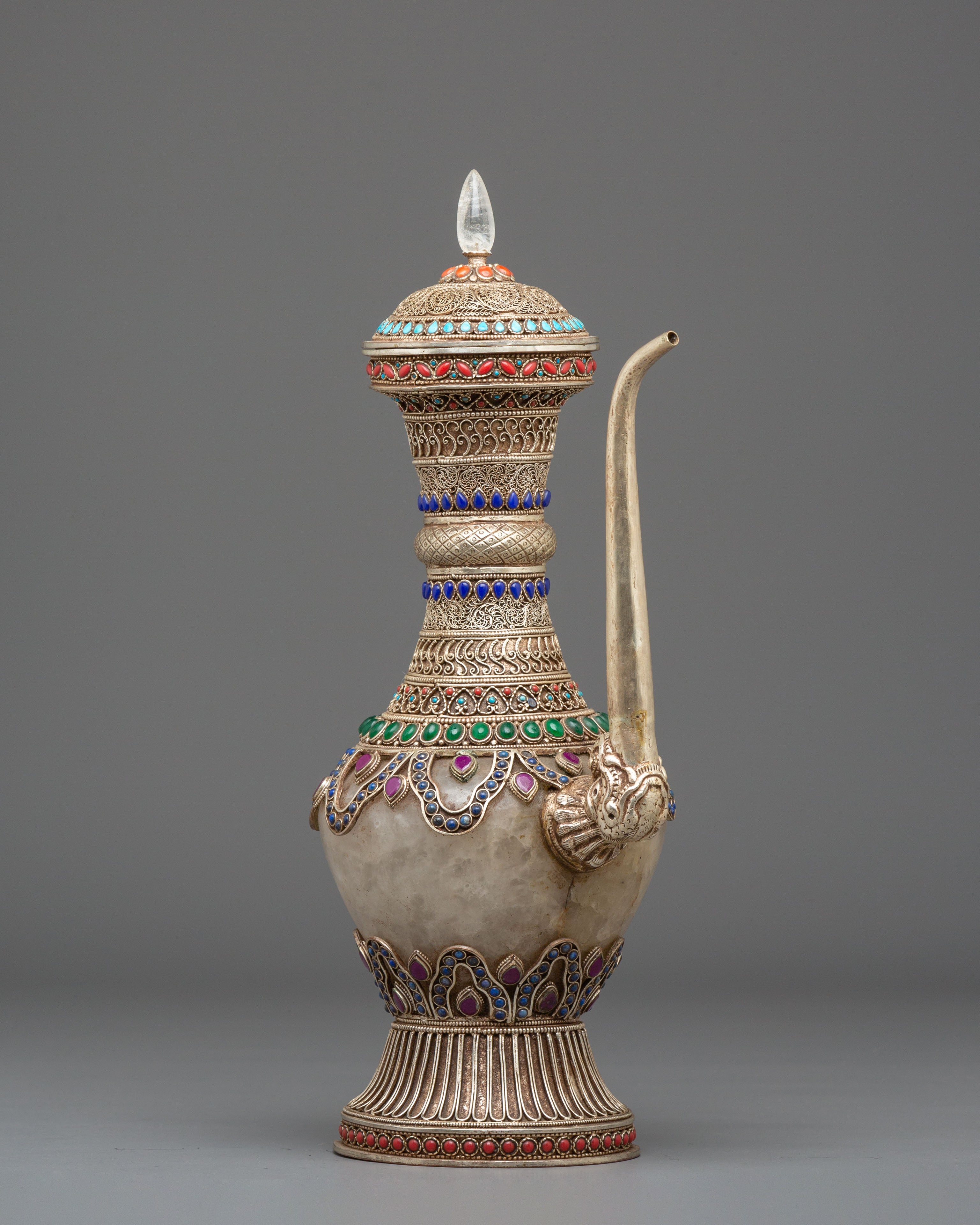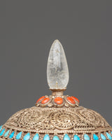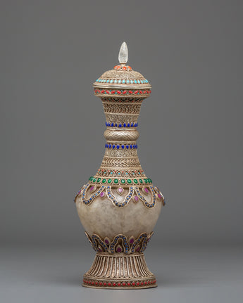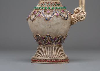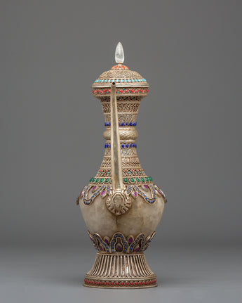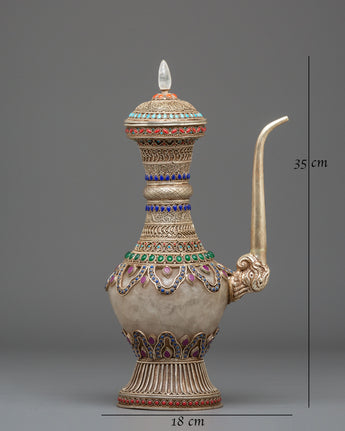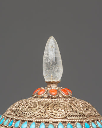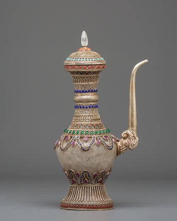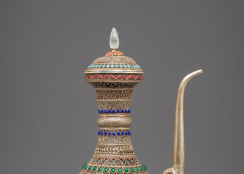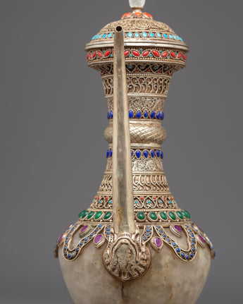 The Sacred Decorative Tea Pot features intricate motifs and designs, with detailed carvings on the copper body that reflect traditional spiritual symbols. The natural quartz brings clarity and purification, while the crystal adds a sense of energy and healing. Natural stones are strategically placed to enhance the pot's energy, with each stone representing a specific quality, such as balance, protection, and tranquility. The silver plating on the pot offers a luminous finish, complementing the natural beauty of the stones and creating a refined yet spiritual aesthetic.