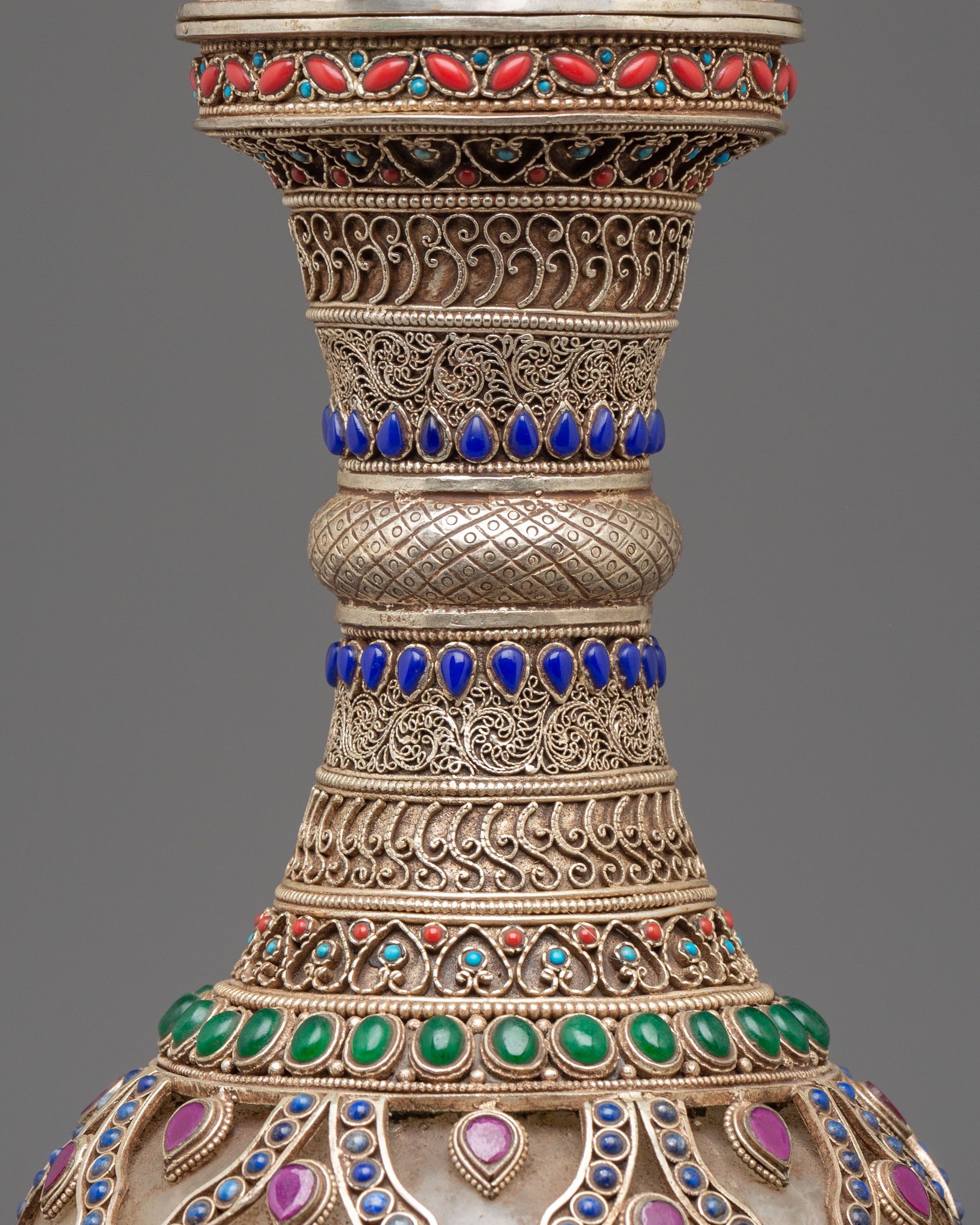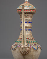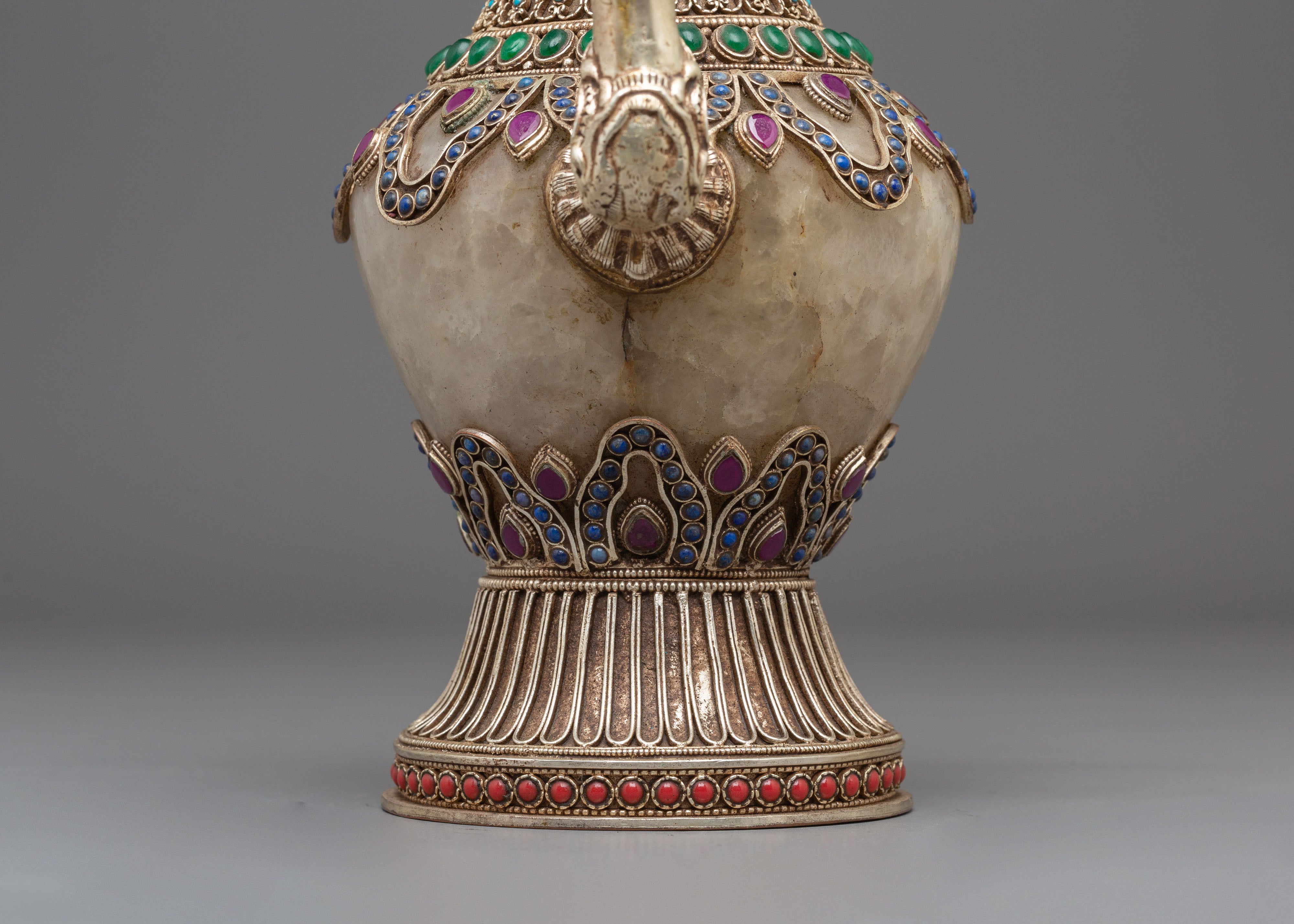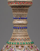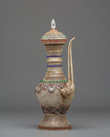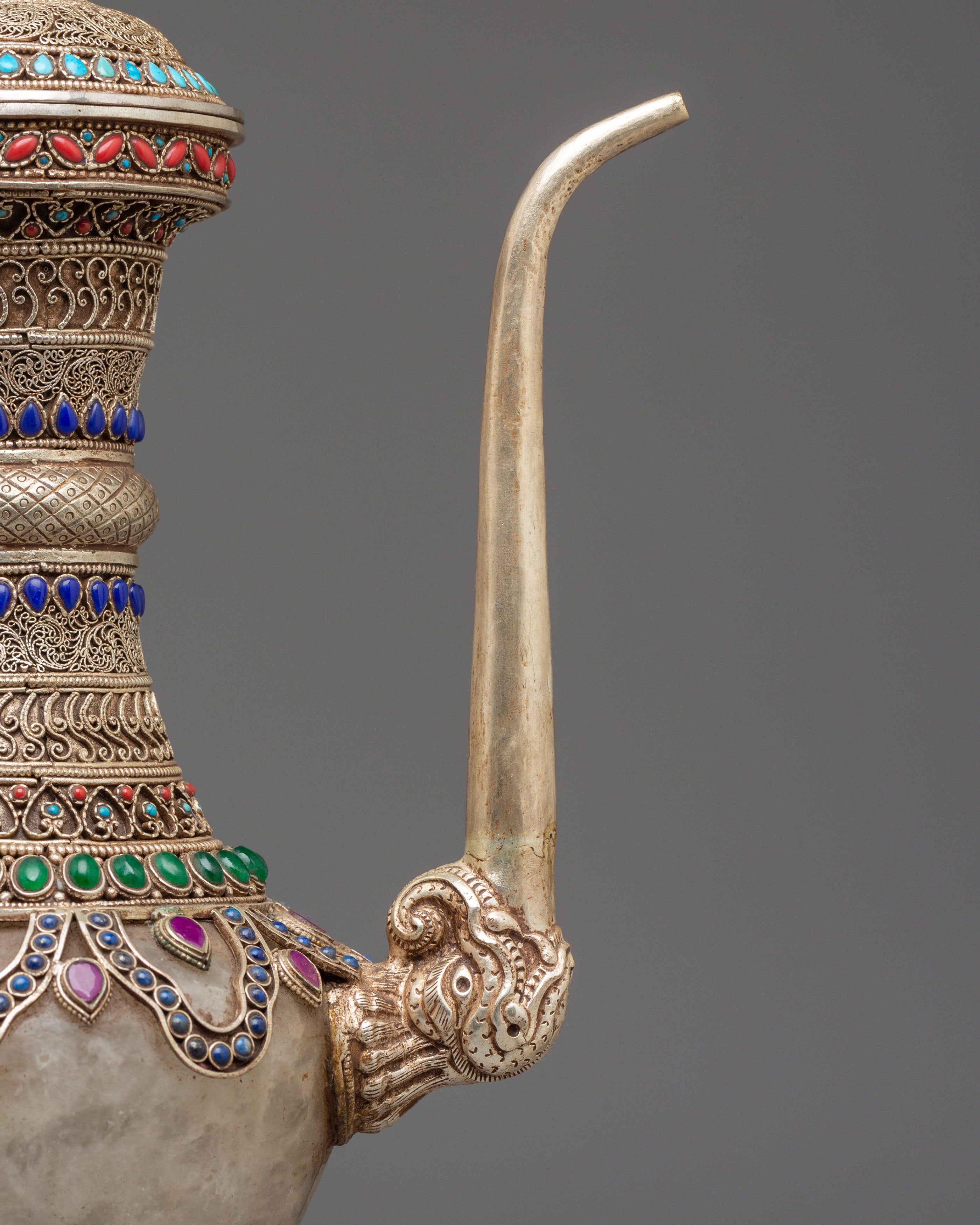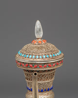The Sacred Decorative Tea Pot features intricate motifs and designs, with detailed carvings on the copper body that reflect traditional spiritual symbols. The natural quartz brings clarity and purification, while the crystal adds a sense of energy and healing. Natural stones are strategically placed to enhance the pot's energy, with each stone representing a specific quality, such as balance, protection, and tranquility. The silver plating on the pot offers a luminous finish, complementing the natural beauty of the stones and creating a refined yet spiritual aesthetic.