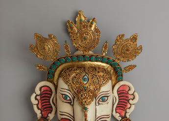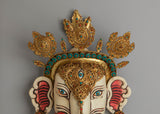 The design of the wall hanging showcases a highly detailed face with gemstone eyes and a gold-plated crown, representing divine protection and spiritual enlightenment. The gold-plated copper body not only adds a touch of elegance but also symbolizes the Buddha's wisdom and the transformative power of spiritual practice. The acrylic colors bring the face to life, highlighting the intricate patterns and symbolic motifs that represent the harmony between the earthly and the divine. The gemstones further enhance the piece's visual appeal, adding color and energy.