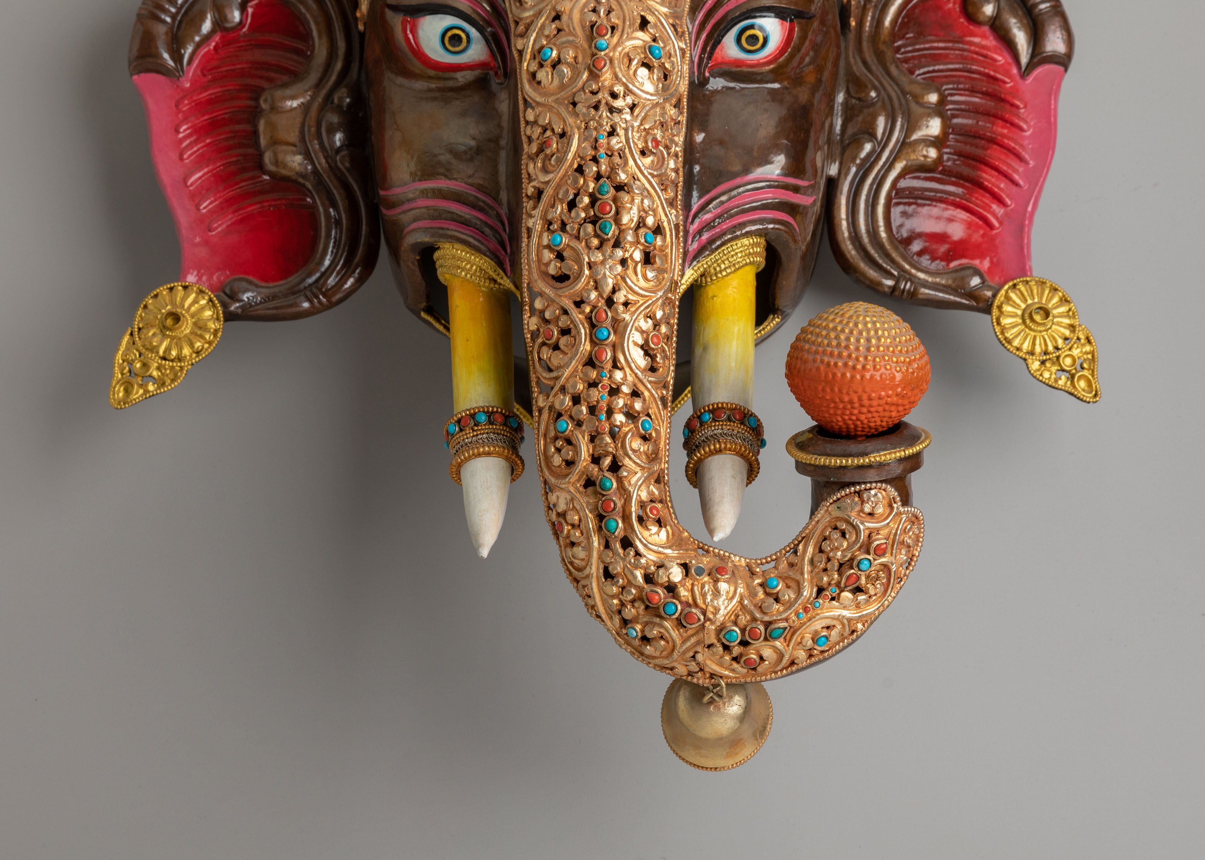 The design of this Ganesha wall hanging features intricate detailing of the deity’s crown, eyes, ears, and trunk, all decorated with gemstone accents. The fire gold used on the crown and surrounding ornaments symbolizes the divine wisdom and spiritual light that Ganesha embodies. His trunk and tusks are accented with golden details that further enhance the piece's spiritual significance. The use of acrylic colors highlights the divine expression of Ganesha, representing his role as the protector and giver of blessings.