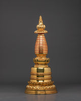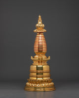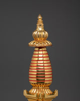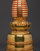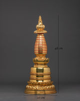The Golden Sacred Stupa is an exquisitely made, spiritually significant work that depicts the Buddha's teachings and the path to enlightenment. This majestic stupa stands 48 cm tall and 20 cm wide, weighs 5.41 kg, and is crafted from copper, tastefully gold-plated to enhance its sacred and timeless appeal. The stupa is a potent symbol of knowledge, tranquility, and protection, making it an excellent focal point for any Buddhist altar, meditation place, or sacred location.