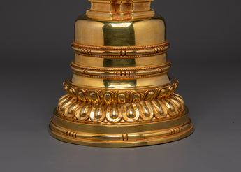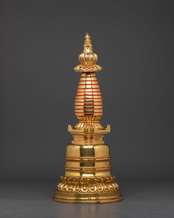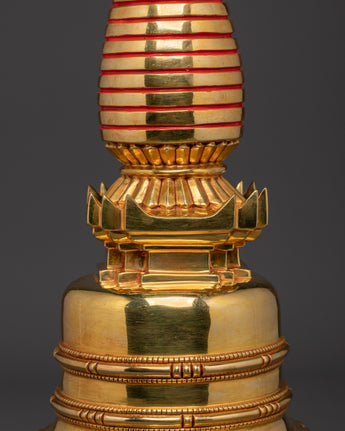 The Golden Sacred Stupa features a detailed design, with a beautifully shaped gold-plated top and intricate layers representing the levels of spiritual enlightenment. The central portion of the stupa features red and white stripes, symbolizing the physical and spiritual union in Tibetan Buddhism. The copper body, with its stunning gold plating, reflects the Buddha’s infinite wisdom and the radiant nature of the Dharma, while the circular base adds a sense of stability and grounding to the piece. The floral motifs around the base represent the blossoming of spiritual practice and the journey toward liberation.