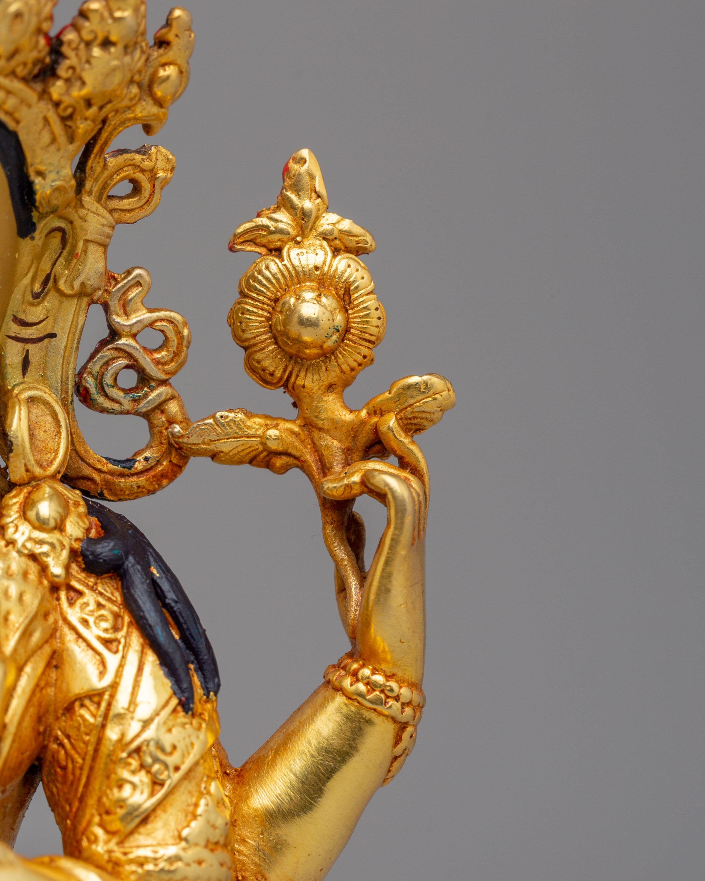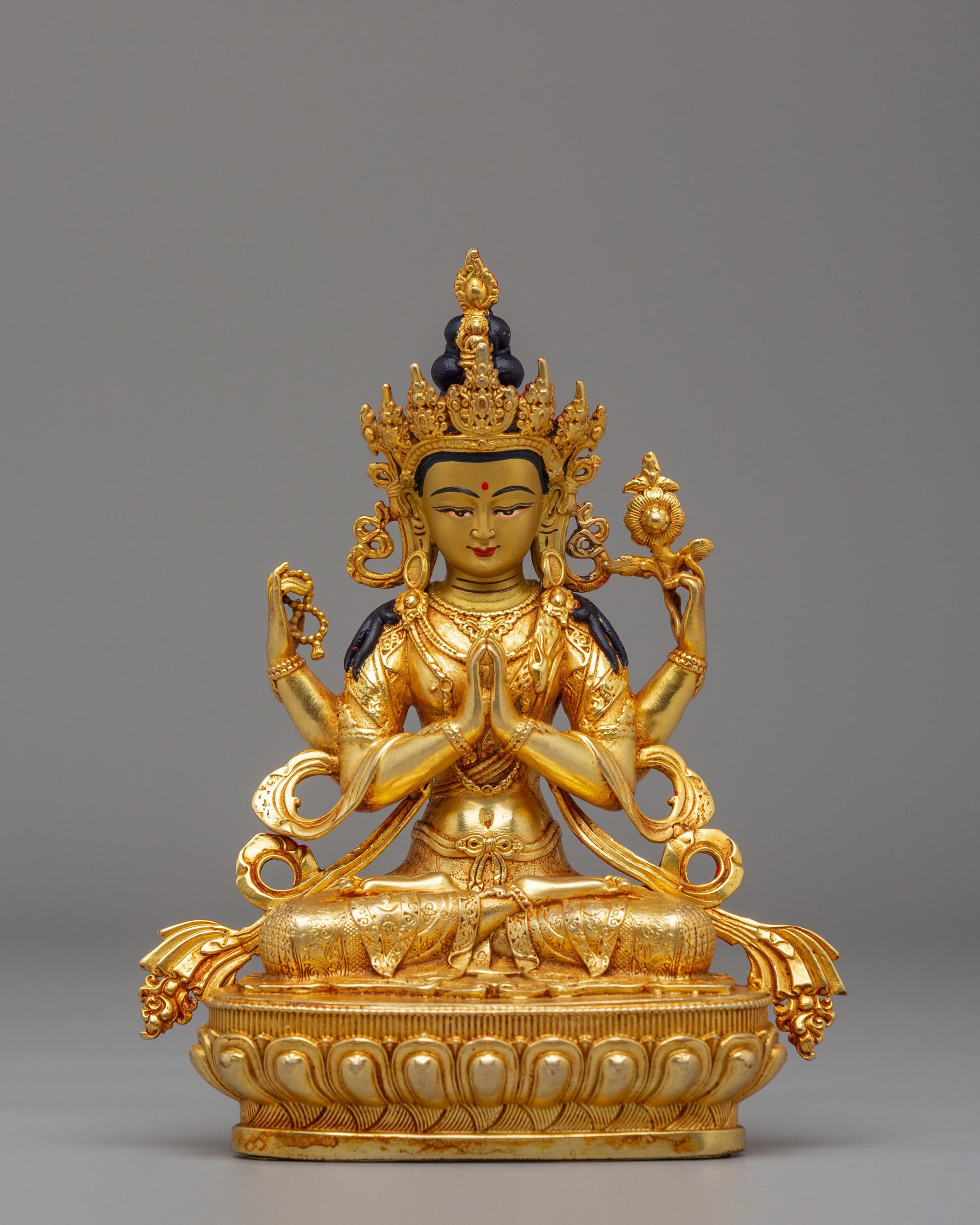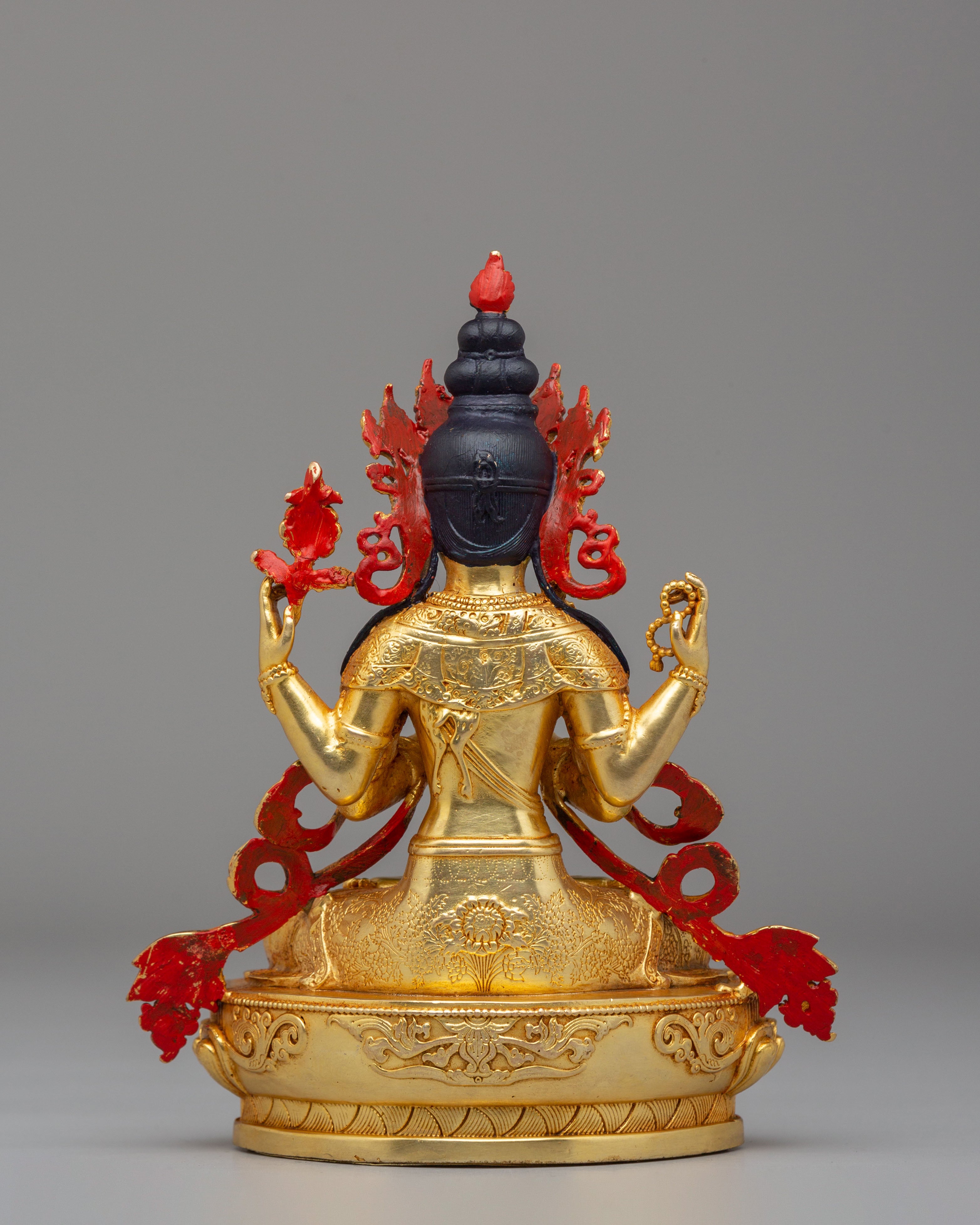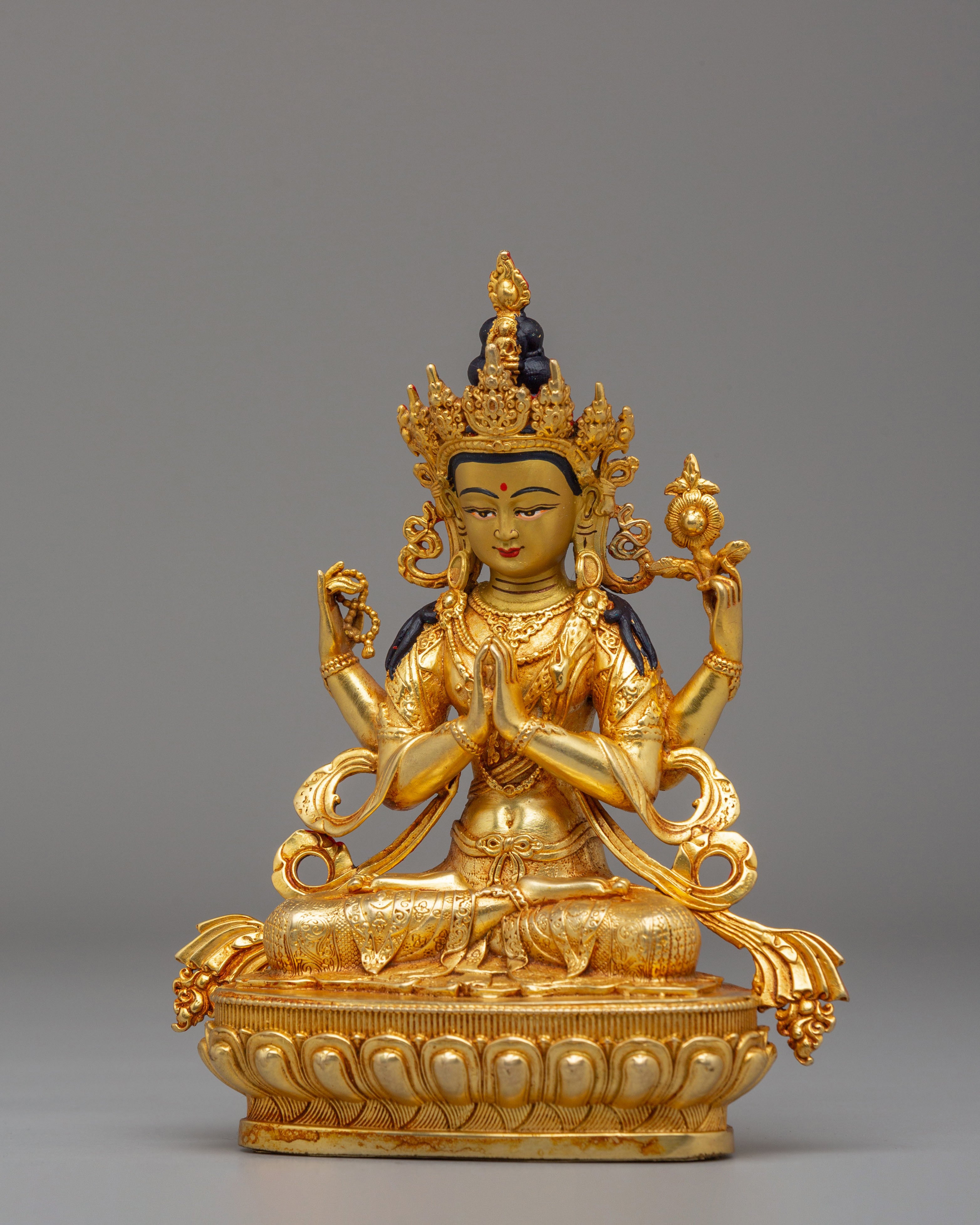 Chenrezig is depicted seated in padmāsana (lotus posture) on a lotus base, with the hands in anjali mudrā holding a cintāmaṇi (wish-fulfilling jewel), symbolizing compassion and benevolence. The upper right hand holds a rosary (mālā) for counting mantras, and the upper left hand holds a utpala flower, representing purity. He wears a five-pointed crown, highlighting his enlightened status and spiritual presence.