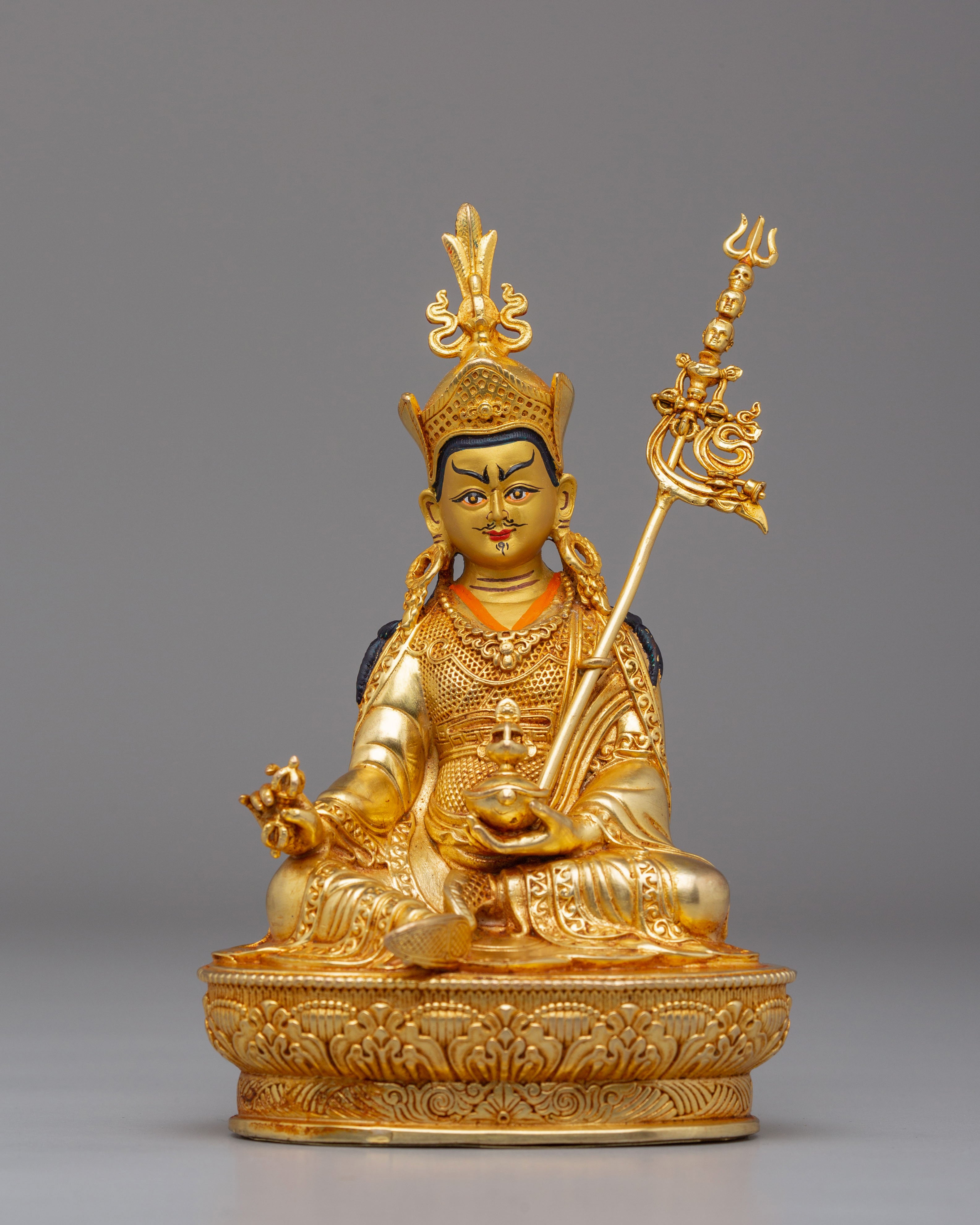 Guru Rinpoche is depicted sitting in a regal posture, exuding confidence and spiritual mastery. His right hand holds a vajra, which represents indestructible power, while his left hand holds a skull cup (kapala) filled with the nectar of wisdom. The khatvanga, a trident ornamented with symbolic components reflecting his tantric attainment and the union of wisdom and compassion, rests on his left shoulder.