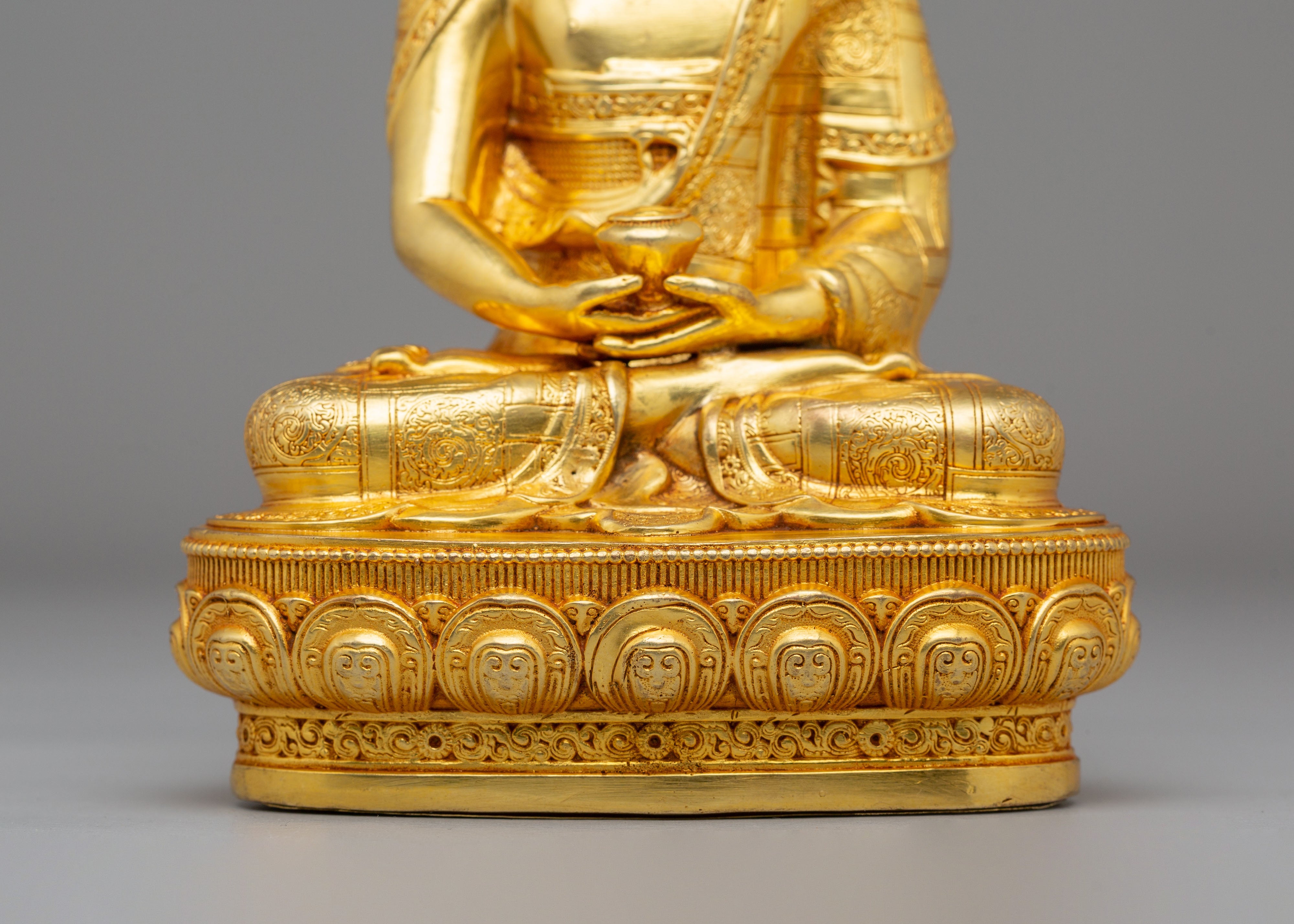 Amitabha is depicted in a tranquil seated posture, holding an alms bowl in his lap to symbolize renunciation and the simplicity of the enlightened life. His peaceful countenance represents the knowledge and compassion he bestows on individuals seeking rebirth in his Pure Land. This gesture demonstrates Amitabha's dedication to helping all creatures achieve spiritual awareness and freedom.